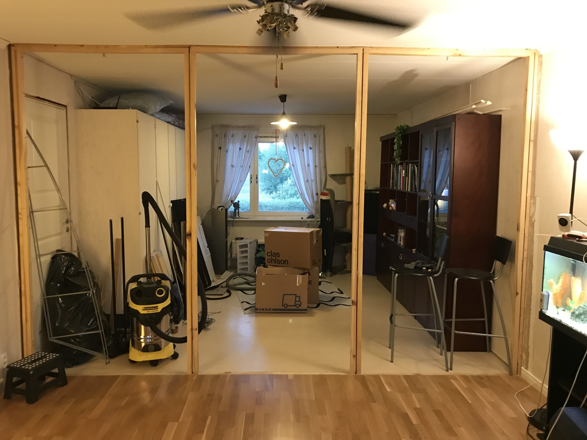 Som rubriken säger, vi håller på och tar bort en vägg mellan stora rummet och ett sovrum, för att få in mer ljus och luftigare stora rum.
