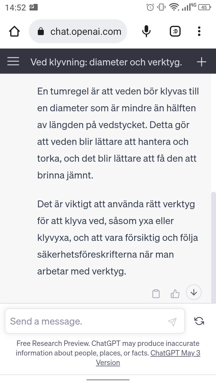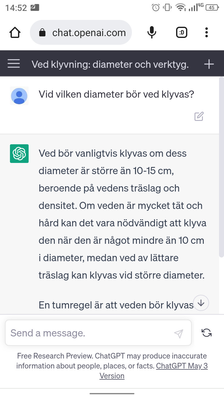 Är i full färd med att klyva ved. Jag funderade över vid vilken diameter man måste klyva veden så jag frågade ChatGPT. Det här var svaret jag fick av den. Stämmer detta? Jag har aldrig hört talas om denna tumregel iaf.