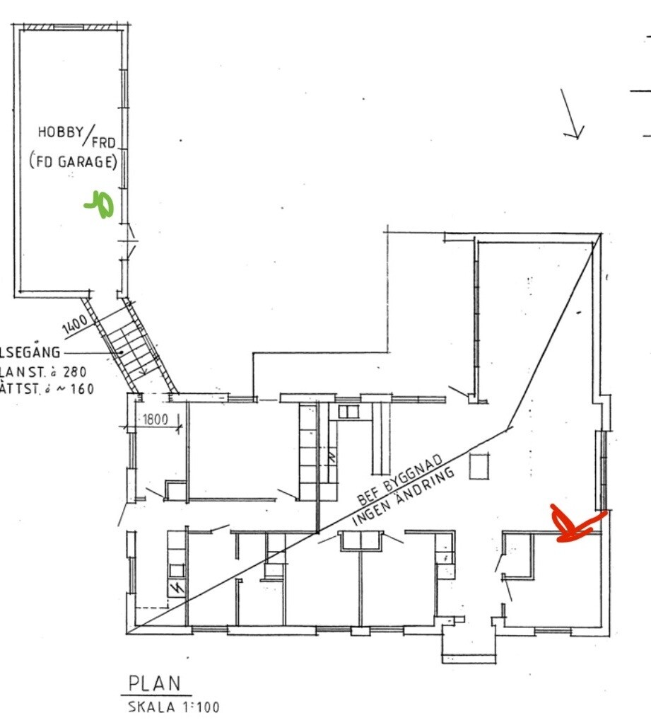 Bor i ett hus som är nästan u format. Jag bifogar med en ritning. Den röda pricken är där inkommande fiber är samt router. Jag behöver ha nätverkstäckning även där ringer vid den gröna markeringen är, vilket det inte är idag. Fågelvägen är det ca 20m dit.