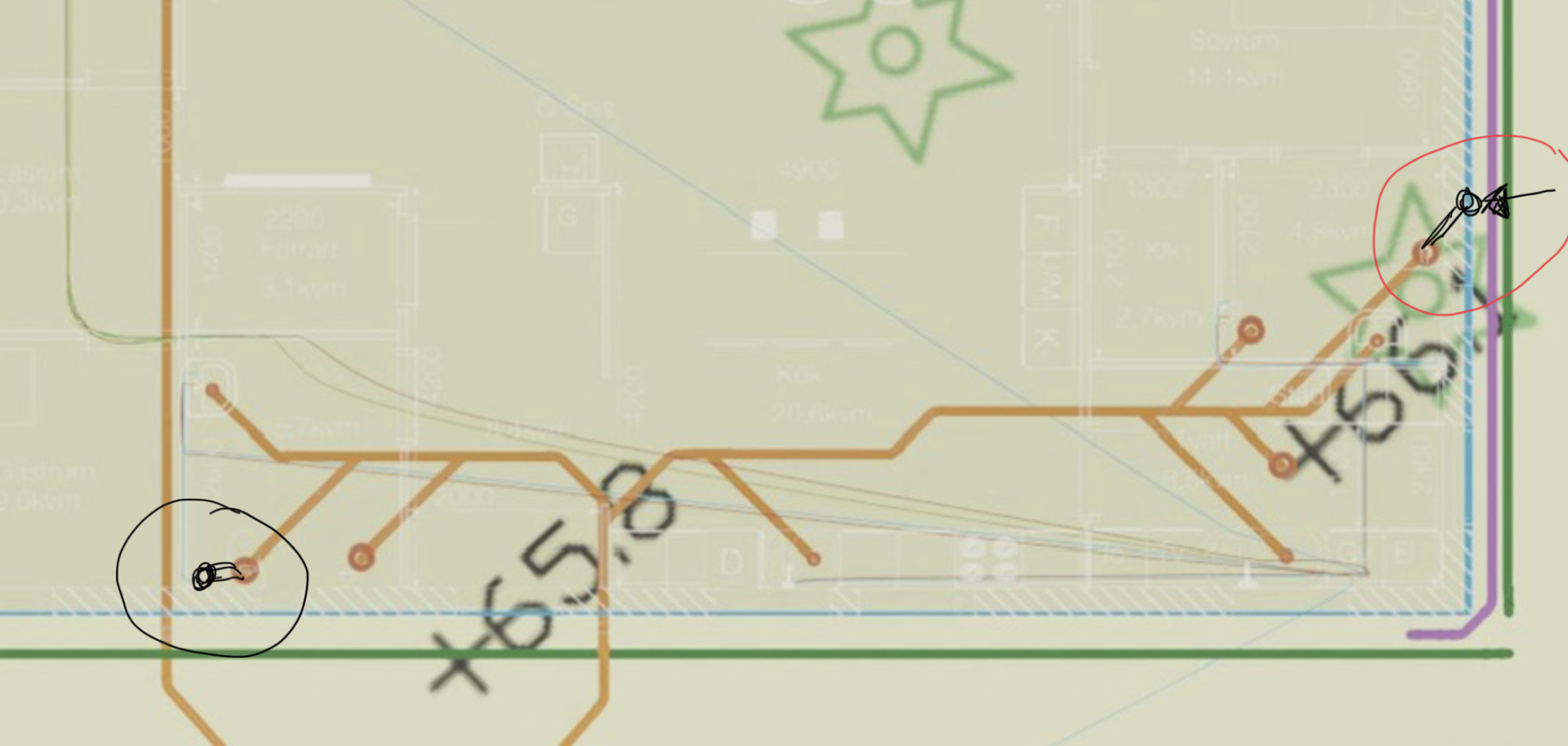 Min skiss på rördragning gör att avloppet går från respektive ytterkant på huset in mot mitten - detta för att få plats med fallet - jag har svårt att komma ner i marken. Jag har planerat för en avluftning, till höger på bilden.