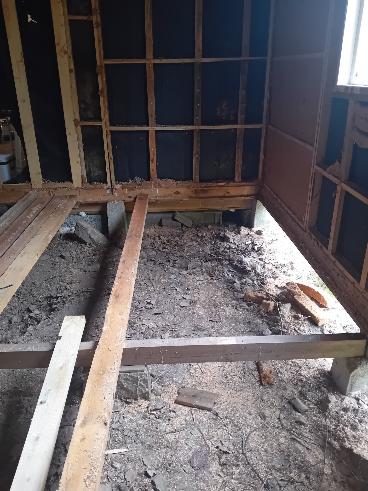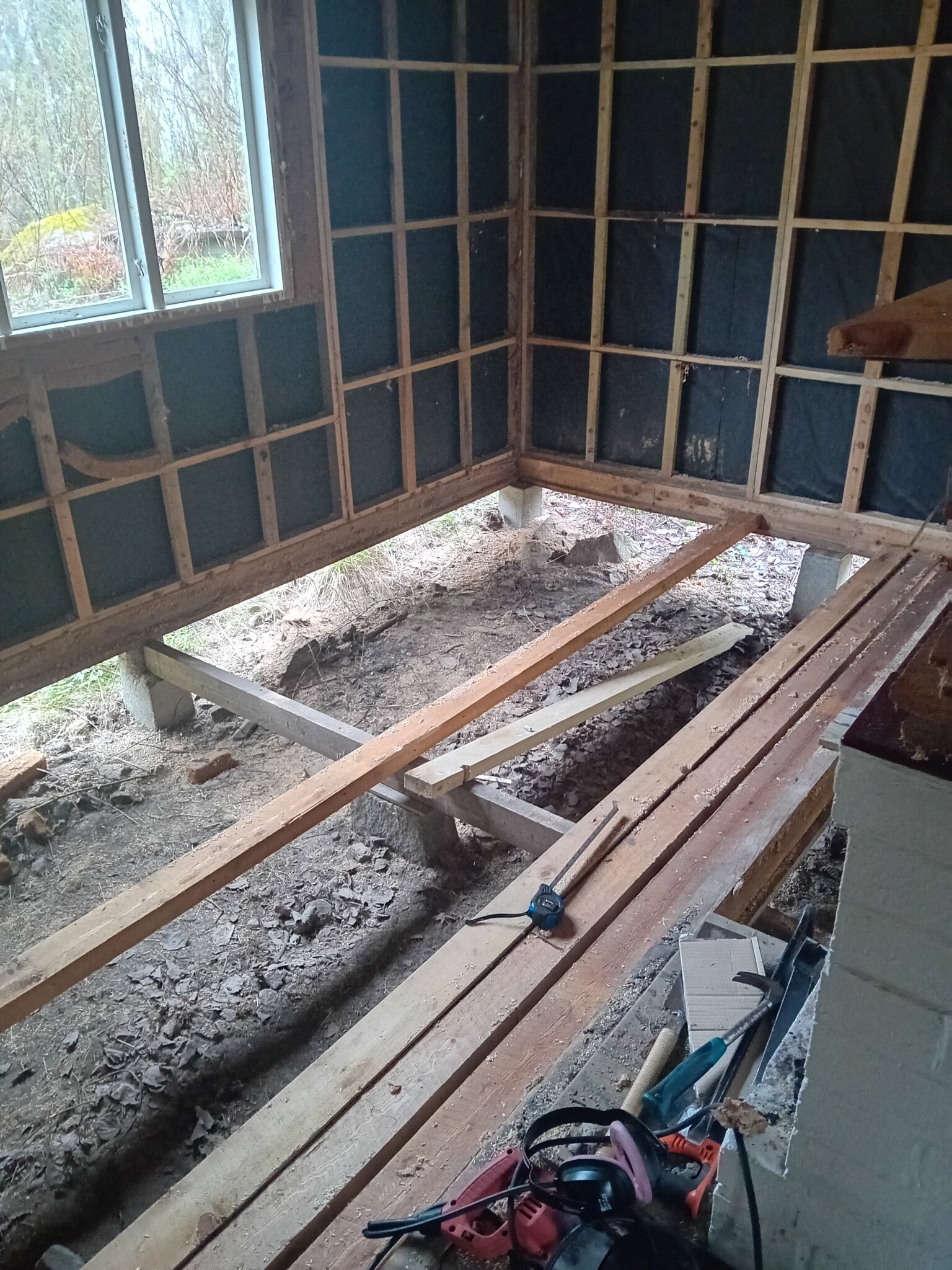 Närå, balkskor skulle ju kännas bra. Om det finns så långa. Annars får jag skråskruva tänker jag. Det förra bjälklaget hängde i syllen med några spik, och så fanns ett upplag i mitten av huset oxå. Jag kommer ha en bärlina i mitten.