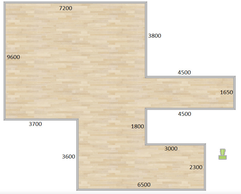 Så här ser ytan ut idag, och nedan är tv-vägg inritad i tjock svart. Och hur jag tänkt mig att man kanske kan lägga t-lister i golvet för låta det svälla/krympa om det behövs (längsta diagonala måttet är ca 15 meter)