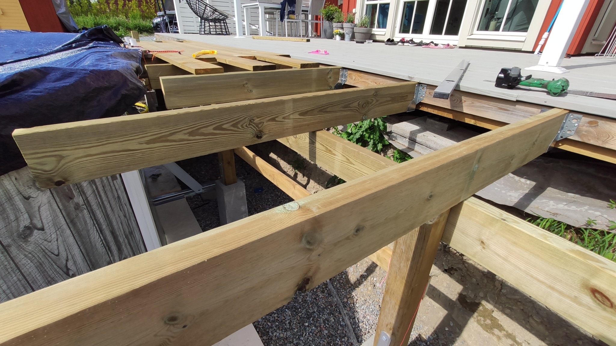 Det kommer att komma upp veranda runt hela poolen, och den nya verandan kommer att fästas i den gamla.