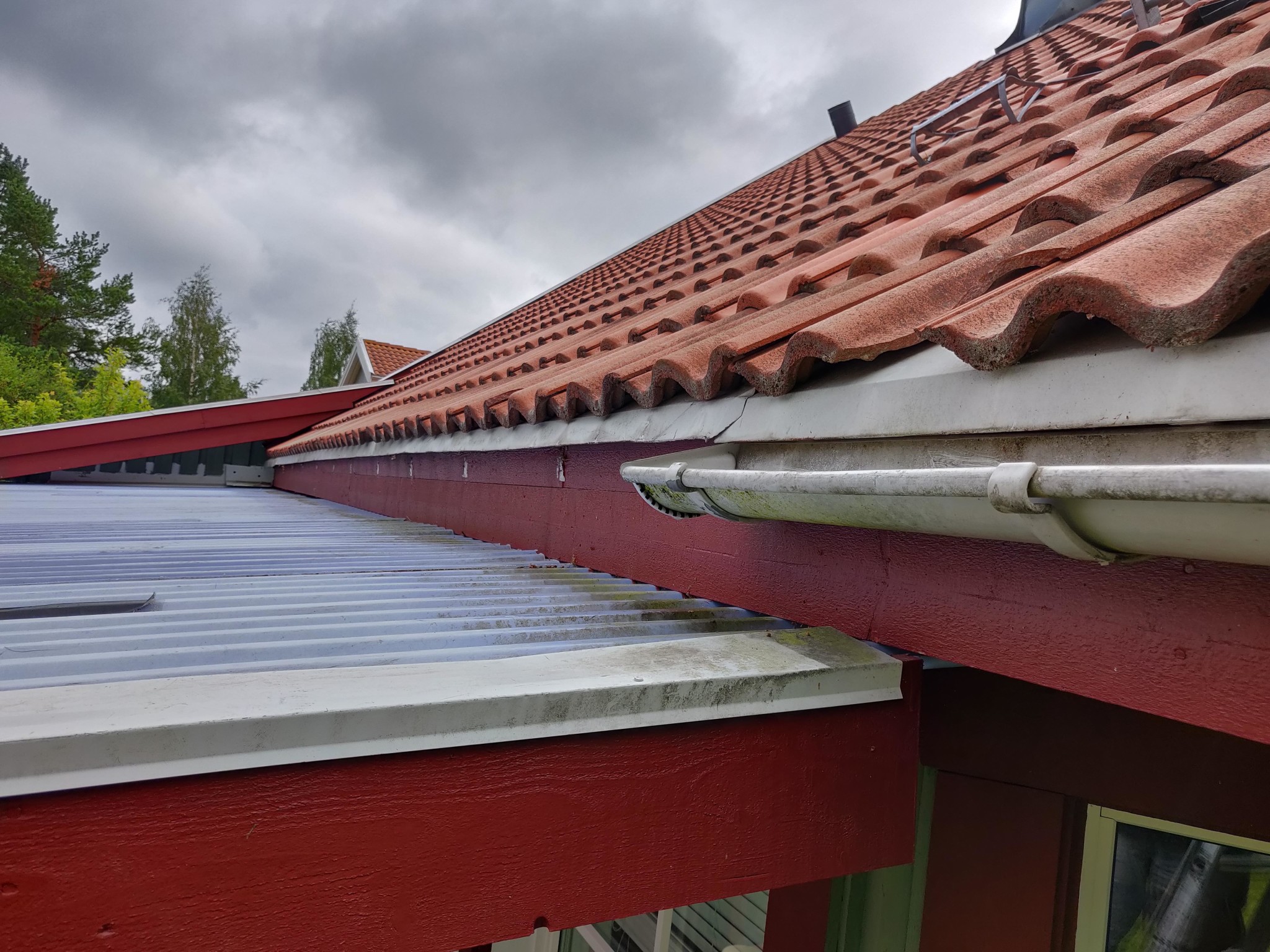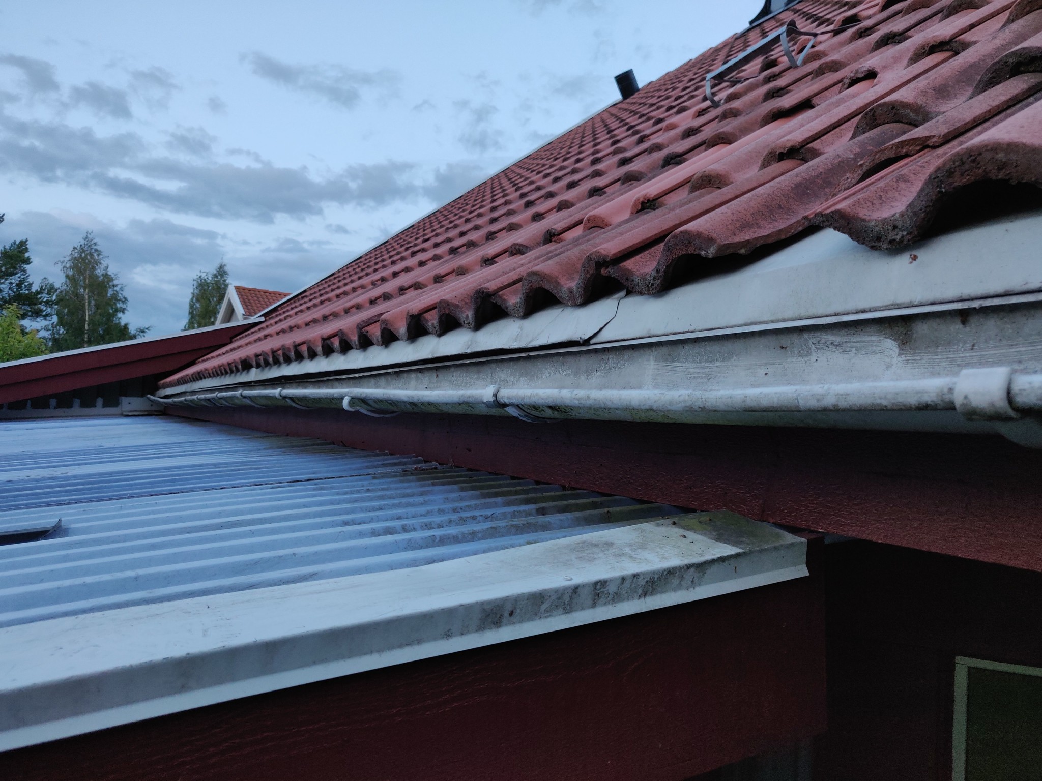 Altantaket har suttit i 10 år utan problem men förra vintern var extrem; det smälte och frös om vartannat så till slut hade det bildats en 3-4 cm tjock isskorpa i botten och när sen alltihopa åkte ner och det sen låg ca 30-40 cm packad snö ovanpå isskorpan så knäcktes detta i skarven och den vassa underliggande isen spetsade då taket på ett flertal ställen. Min senaste idé är då att bygga nåt som utjämnar detta, alltså minskar brytningsvinkeln helt enkelt och det kan man göra på olika sätt; antingen med en plåt som får fungera som "bana" eller så en triangulär längsgående konstruktion som fungerar som "brygga". Klurar vidare på detta.