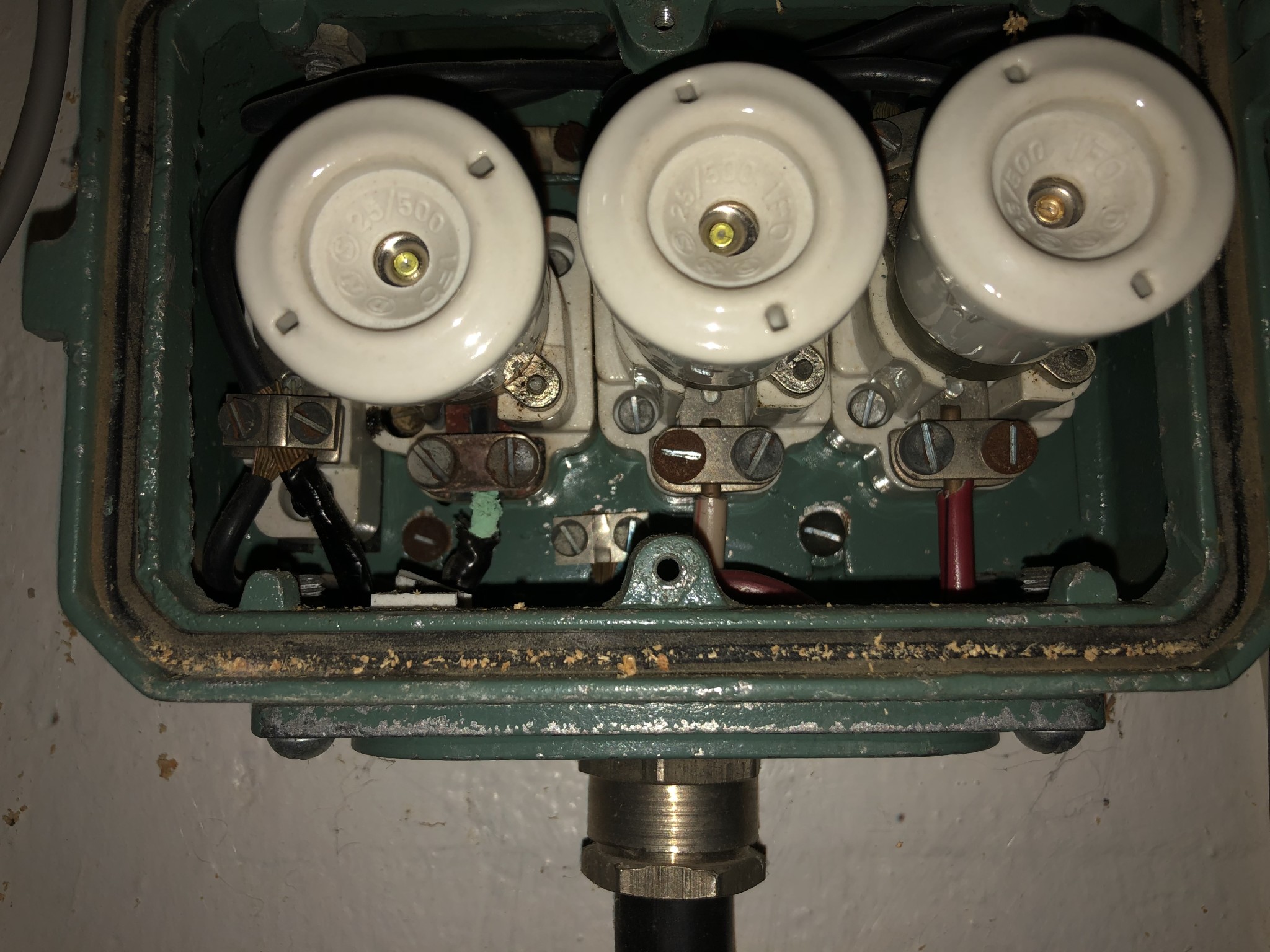 Som ni ser så har en av faserna grön beläggning innan/efter säkring och koppar tråden är svart på inkommande. Dom andra två faserna har inte detta. Är detta ett potentiellt problem eller är det normalt? Hus är från 1920 tal.