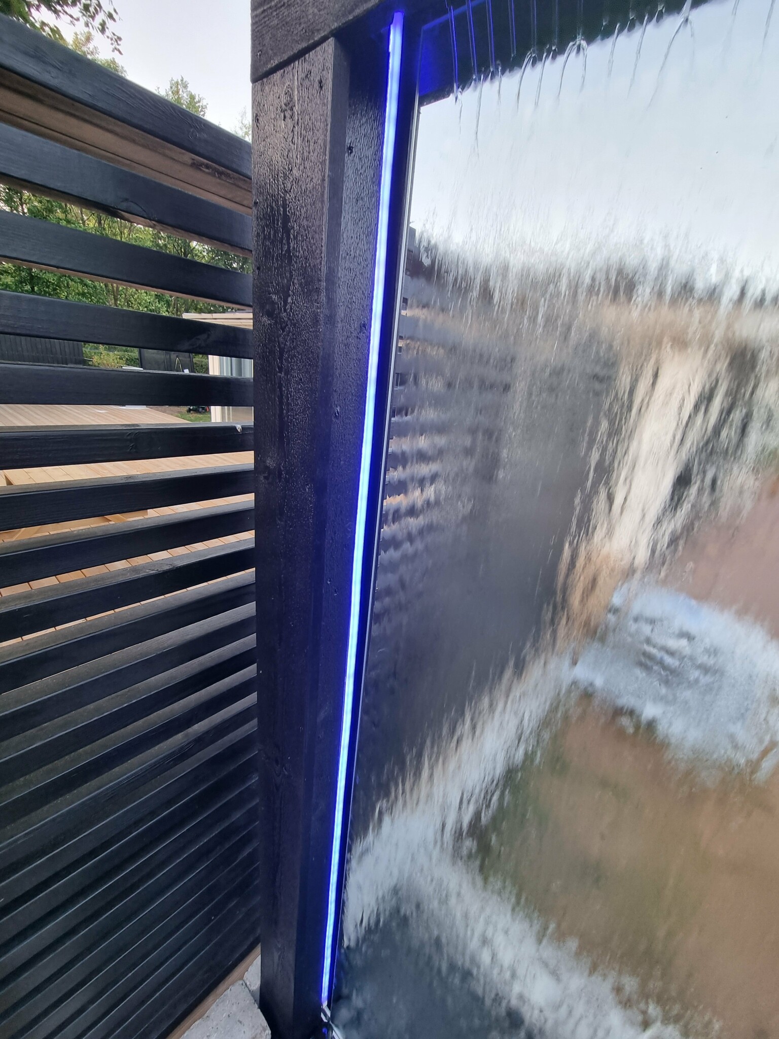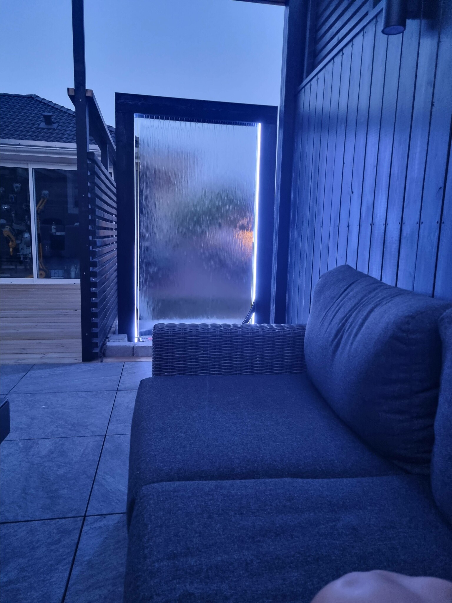 Hej, jättefin vattenvägg med belysningen! Tack för inspiration!
