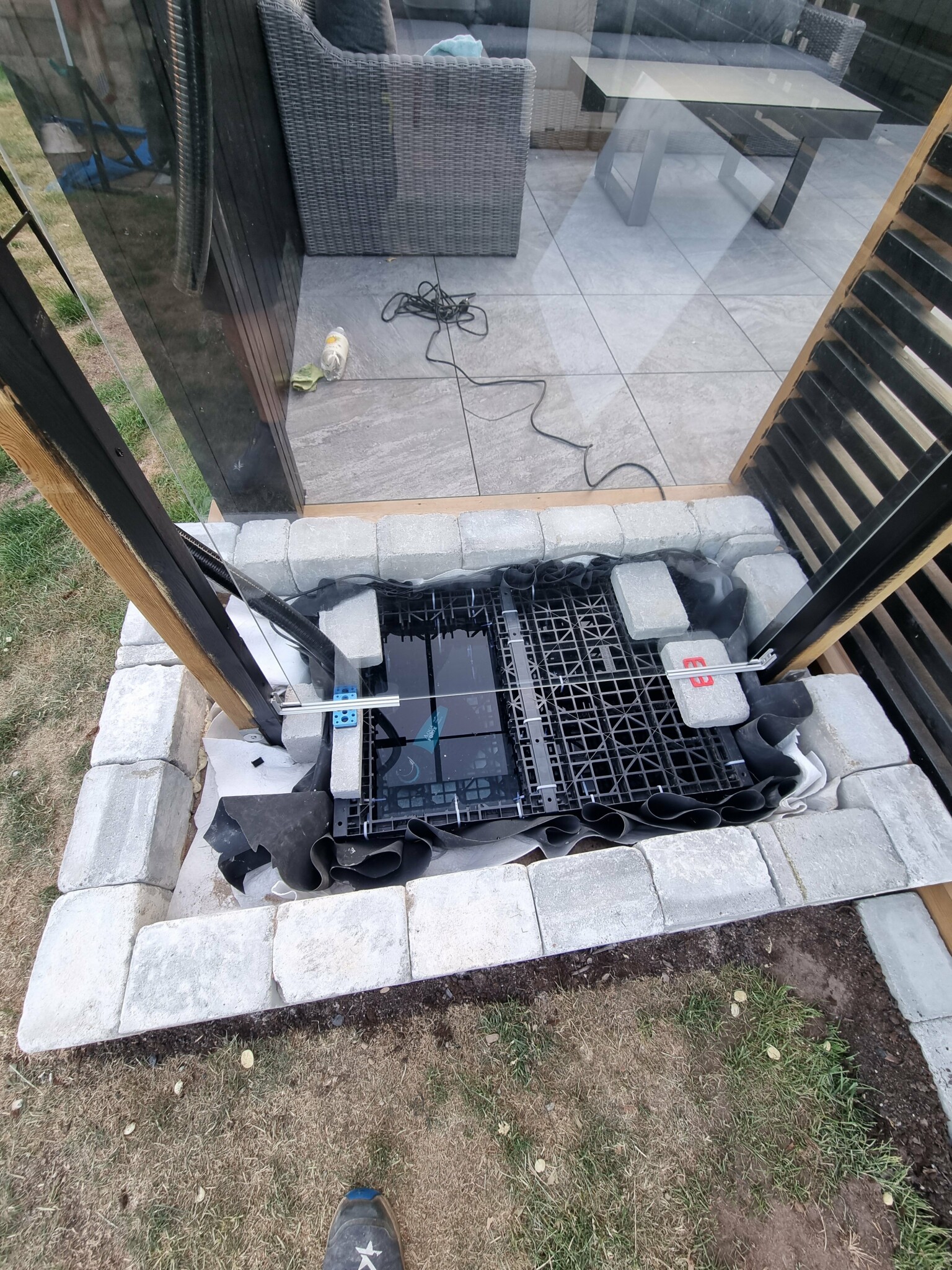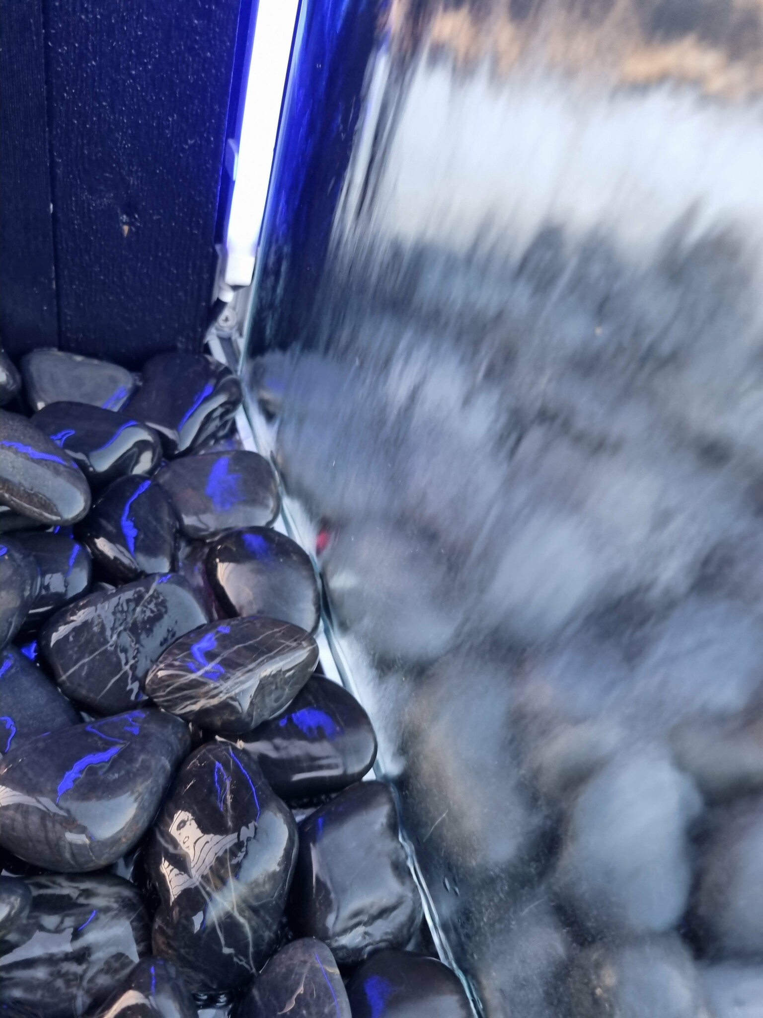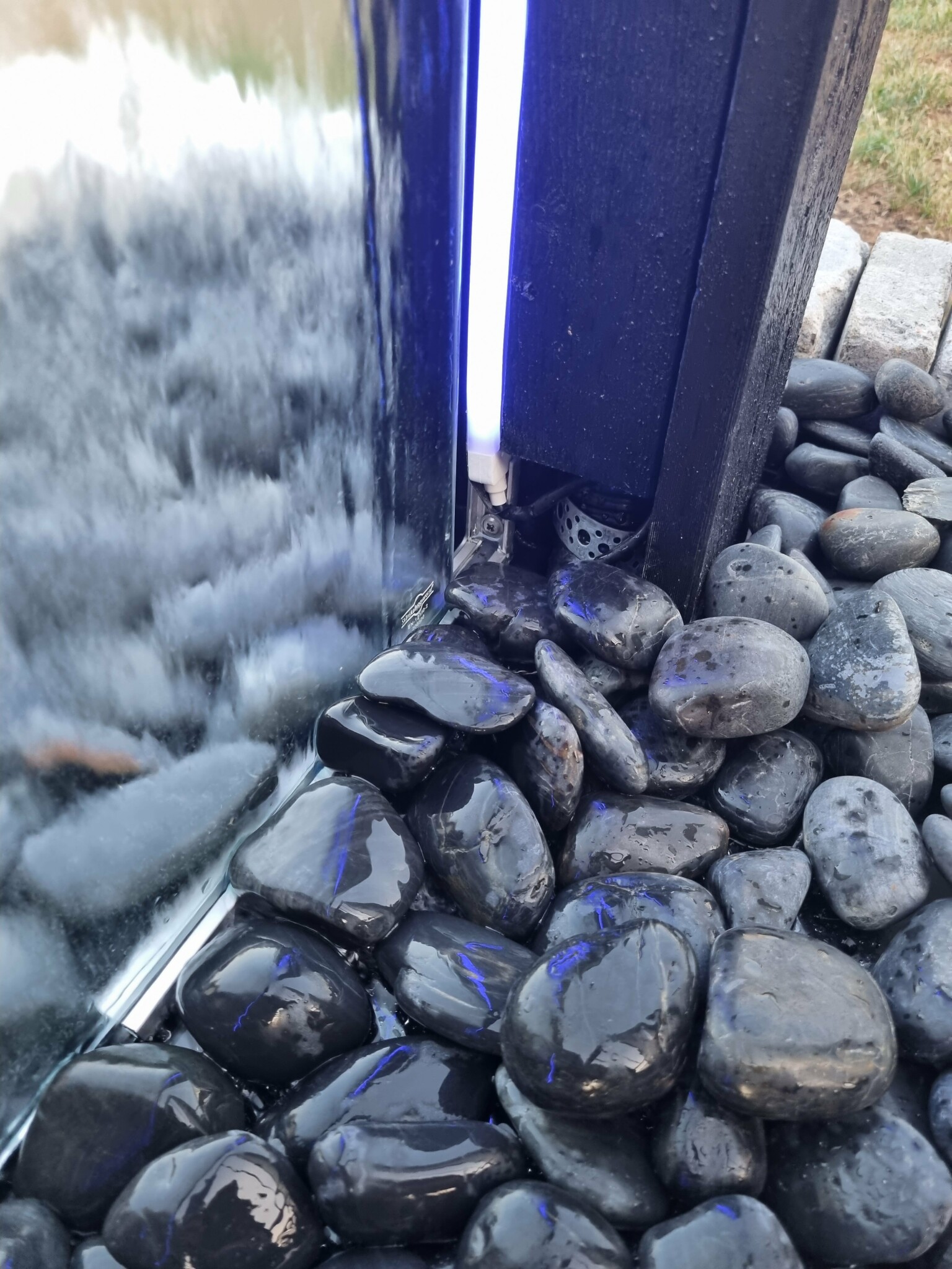 Nere tänkte jag ha svart dekorsten. Blir det inte bästa att belysa underifrån? Tänker mig någon ledbelysning. Men då måste den tåla att ligga i vatten.