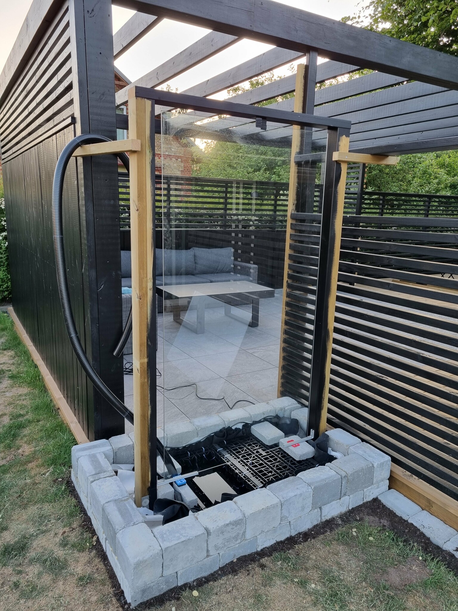 Pergolan på run 9-12 m2 tänkte jag ska ha liggande ribbor på baksidan och det är inga konstigheter. Men på ena väggen ut mot trädäcket tänkte jag göra ena väggen som en vattenvägg just för att förhindra vind och insyn.