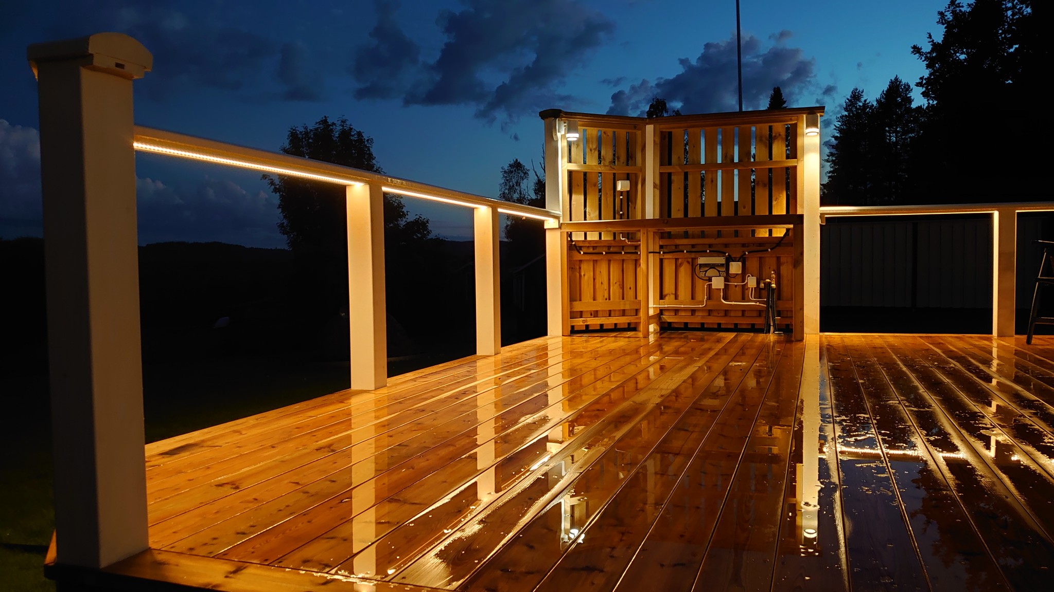 Altanen är inte klar. Men de tar sig. Just de - armaturerna. Köpte bara ett par simpla rackare på Bauhaus. Inga konstigheter.