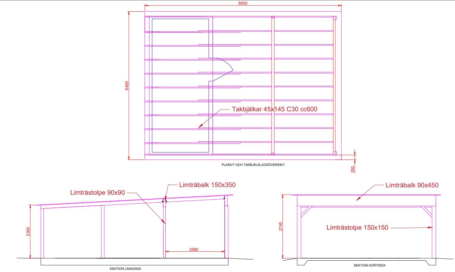 För att hålla nere totalhöjden tänker jag 45x145 C30 takbjälkar cc600 samt att dom fästes mellan limträbalkarna, se bild för förklaring.