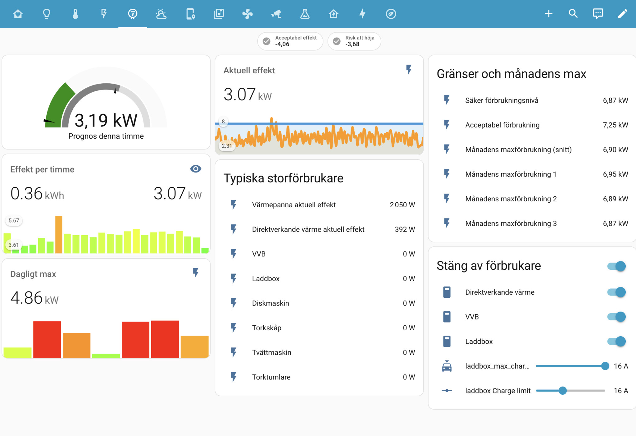 Det är svårt att lösa med automatisering, utan där krävs beteendeförändring. Om vi lyckas med det (vet inte om jag får med familjen på det), så har ju redan den här översikten/mätvärde-panelen haft effekt (no pun intended). Men det gav också insikten att min idé om att man alltid kan stänga av VVB om man ser en potentiell topp kanske inte nödvändigtvis funkar. Då blir det kallt för den som duschar sist, och det lär inte vara poppis. (Eller så är det incitament att sprida ut duschandet ;-)).