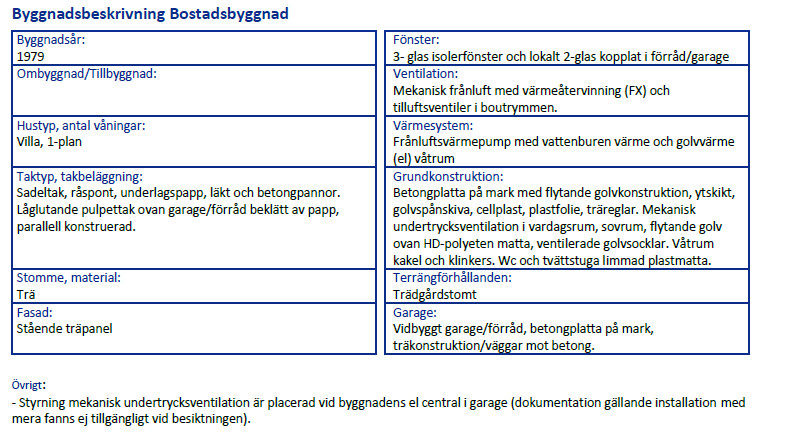 Byggnaden är enligt min bedömning i ett allmänt välskött och gott skick. Noterade anmärkningar är relativt få, men förväntade med tanke på ålder och byggnadssätt samt viktiga att känna till för att förebygga risken för mer omfattande framtida skador. De viktigaste punkterna enligt mig är tvättstuga och golvkonstruktion