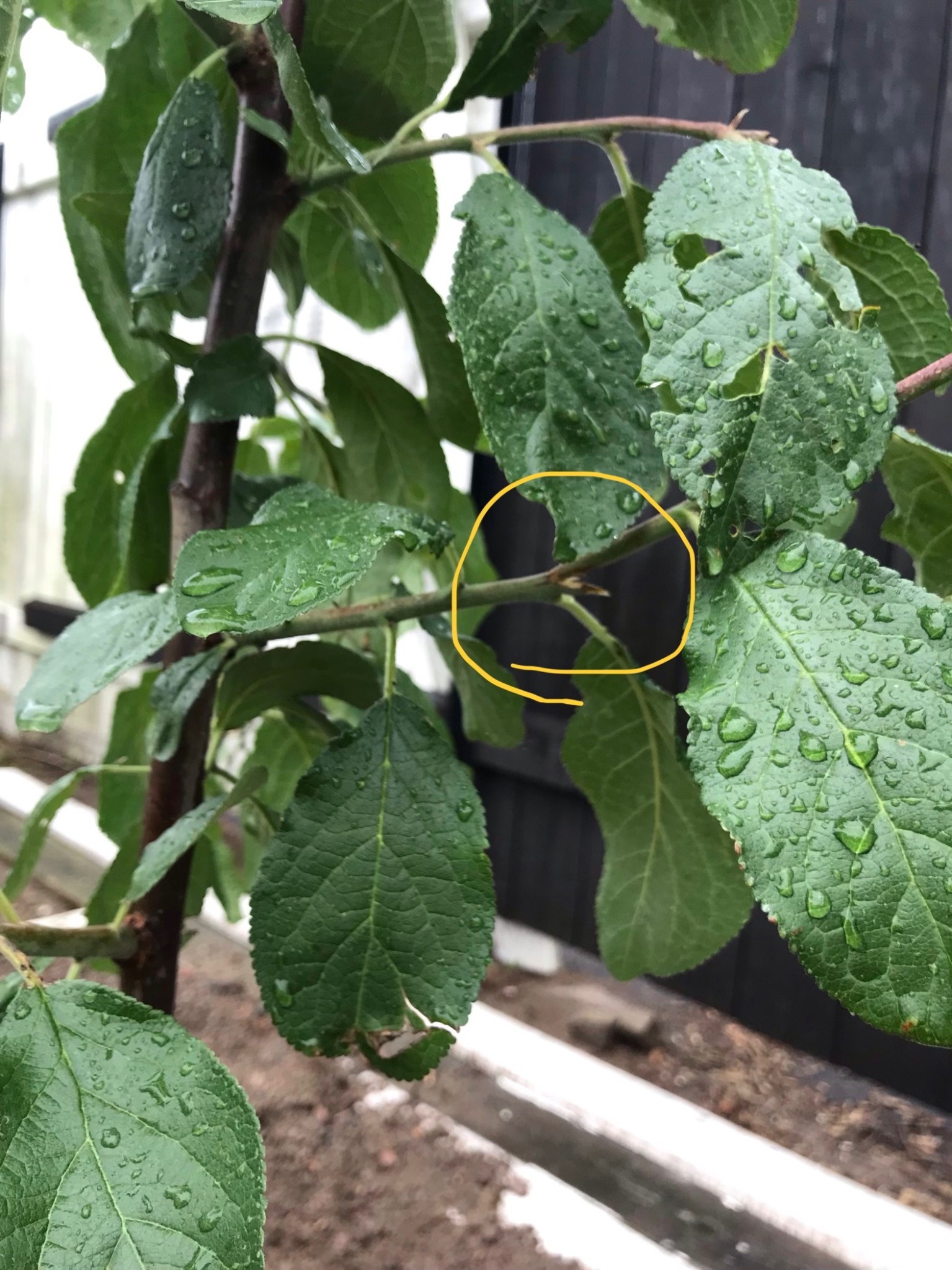 Så vitt jag kan se i det inringade området så verkar det vara en gammal skada där det har bildats en ny gren ovanför. Du kan möjligen putsa bort resterna av det gamla så det blir ett rakt snitt.