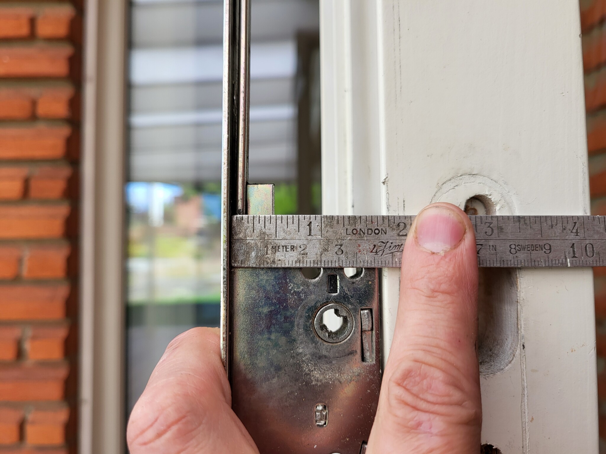 Dornavståndet mäts från framsidan av skenan (alltså andra sidan jämfört med på din bild) till centrum av hålen. Jag hade valt att vrida det fyrkantiga hålet 45°, och mäta till det hörn som då hamnar uppåt.