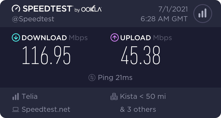 Det konstiga är att vid dessa tillfällen får jag bra fart på bredbandet på min telefon (också Telia), normalt över 30M när mobila bredbandet ligger på 1-3 M...