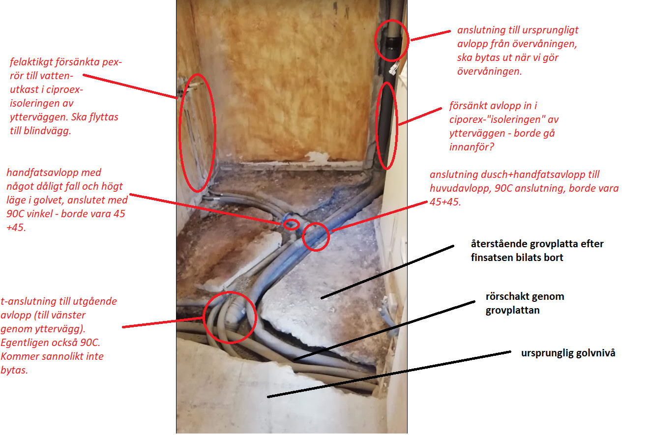 Sen är det ju förvisso samma med avloppsröret i väggen upp - som inte heller antagligen får vara i "isoleringen", men det skulle stjäla så mycket utrymme så det är lite smärtsamt att behöva flytta, men visst, borde antaligen också vara i en trumma. Där lyssnar jag gärna på idéer. (I nuläget möter det gamla avloppet det nya ung mitt på väggen med gummimuff, vilket ska bytas när vi byter rören upp till entréplanet).