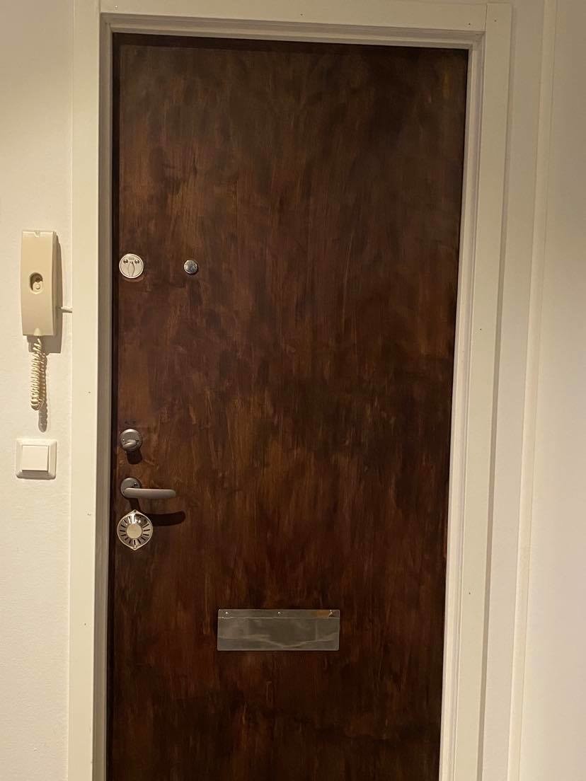 Jag har bara betsat dörrsidan som är på insidan av lägenheten så det borde nog inte vara något problem tänker jag. Ska lacka den med en lack imorgon som skulle ge ökad tålighet