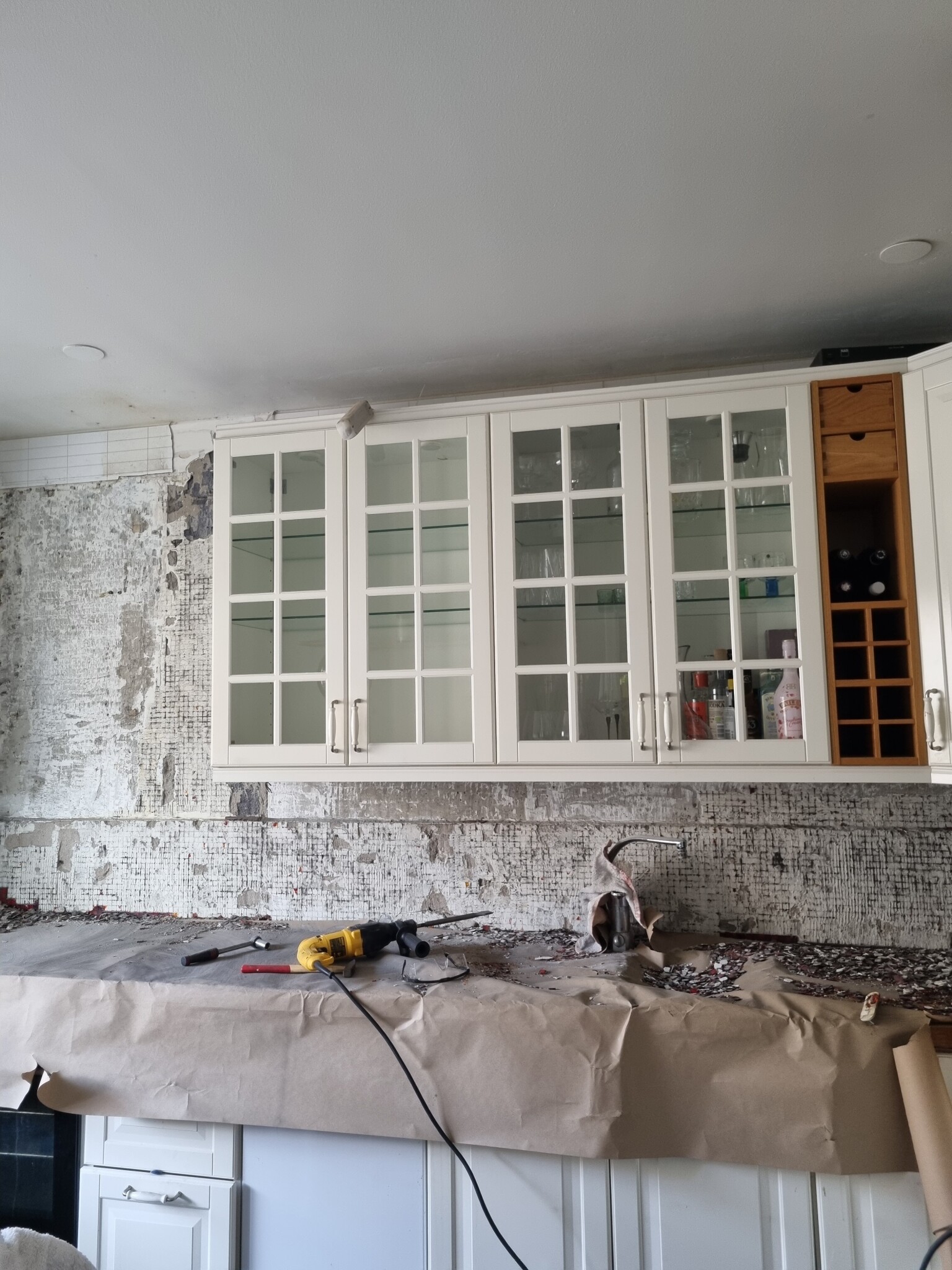 - Spackla den nedre delen av väggen upp till skåpen och lägg på kakel och en list.