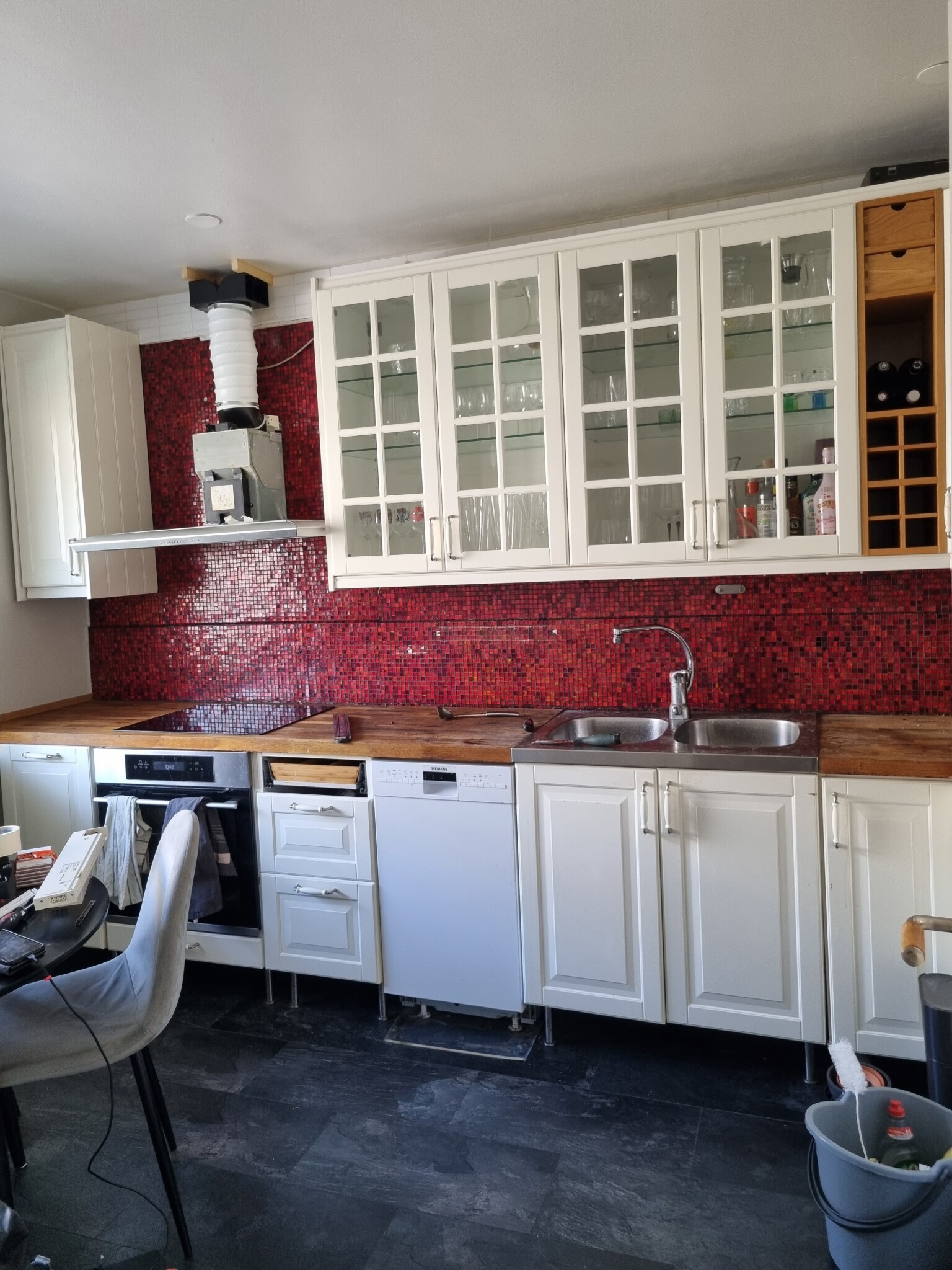 - Spackla den övre väggen tjockare (kommer ta lång tid) eller sätta dit en gipsskiva och lägga en silikonfog mellan skåpen och plattorna