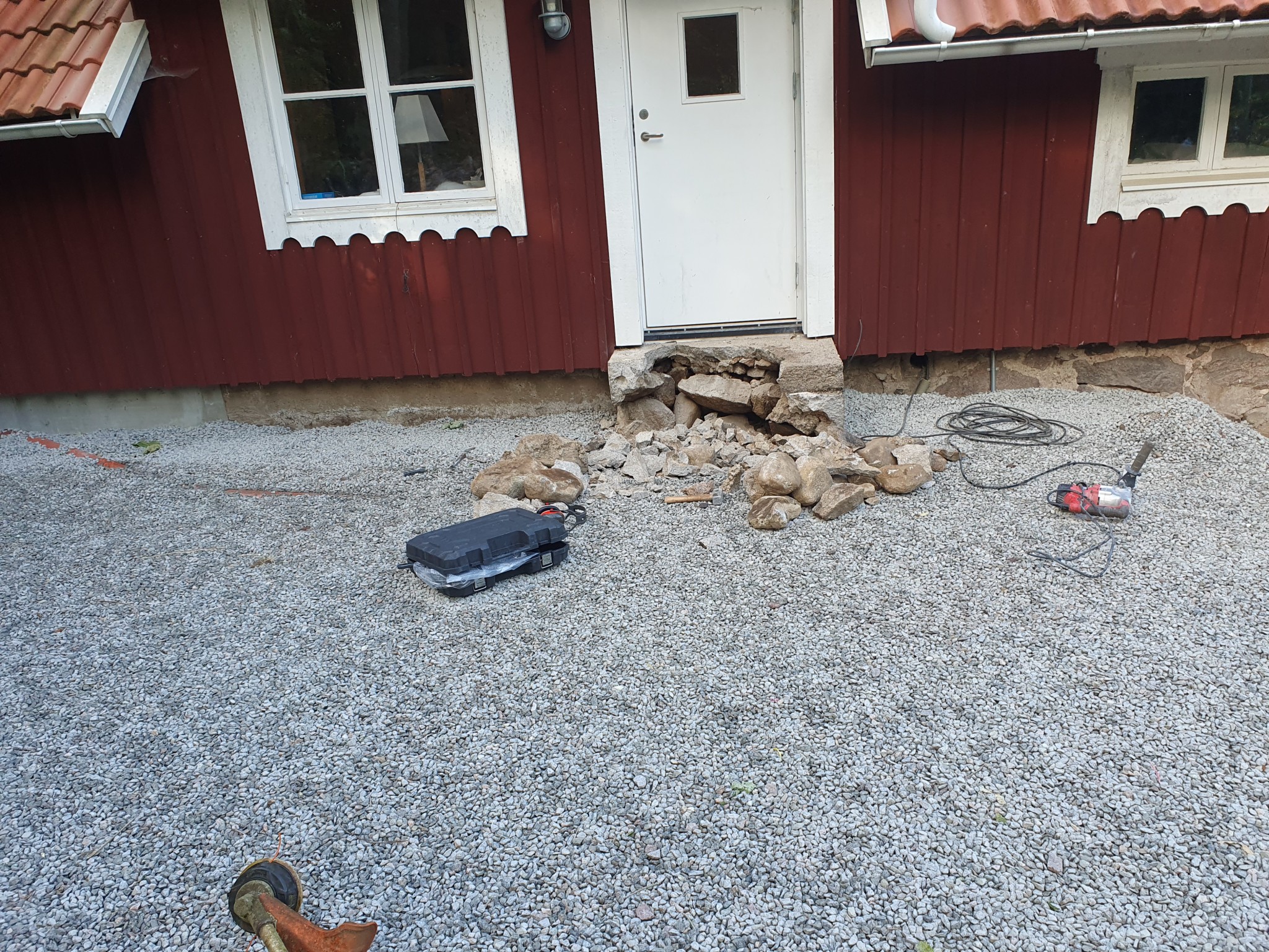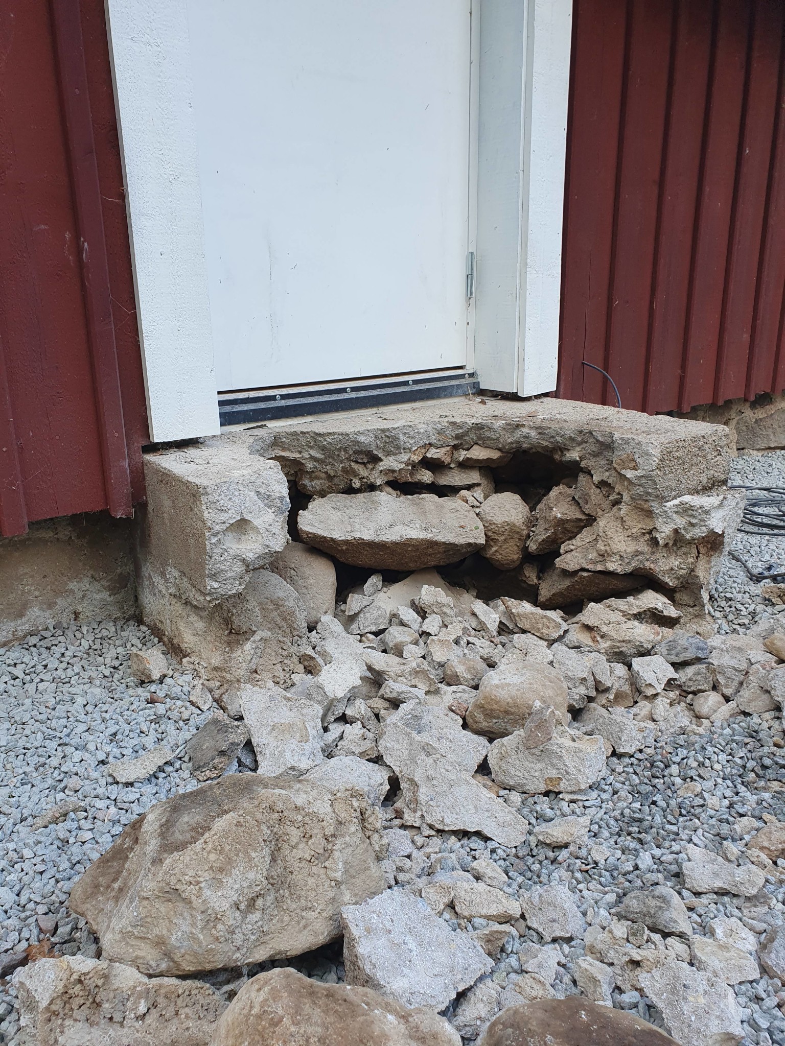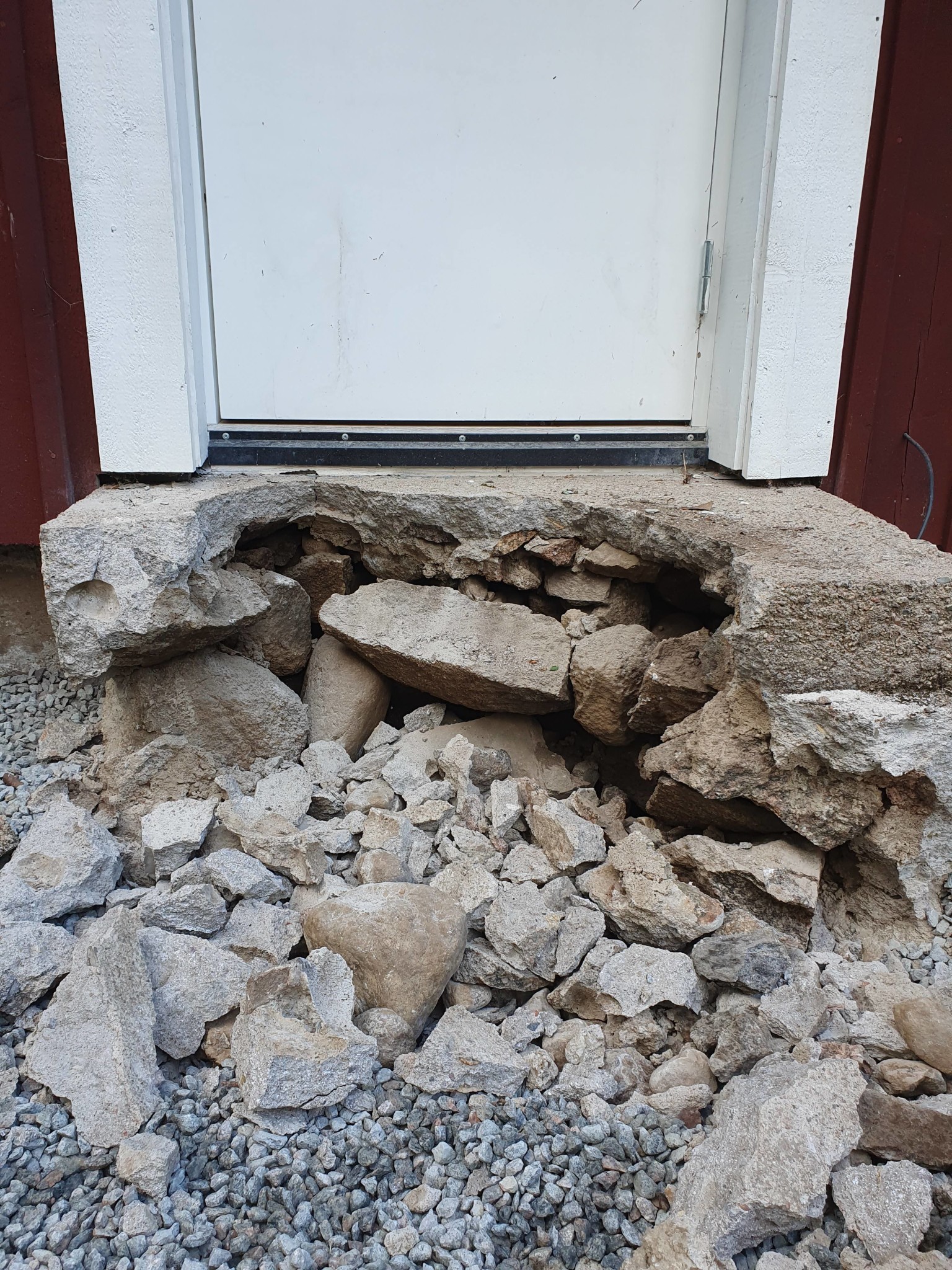 Jag märkte direkt när jag började bila i trappan att det var inte mycket betong. Bara ett skikt på toppen och resten sten och ingen armering. Detta bruka vara ganska vanligt tycker jag på gamla gjutningar. Dock när jag kom närmre grunden så upptäcker jag att trappan sitter ihop med golvet inomhus. Det ser ut som att det är uppfyllt med sprängsten under grunden och att de har fortsatt ut och gjutit trappan.