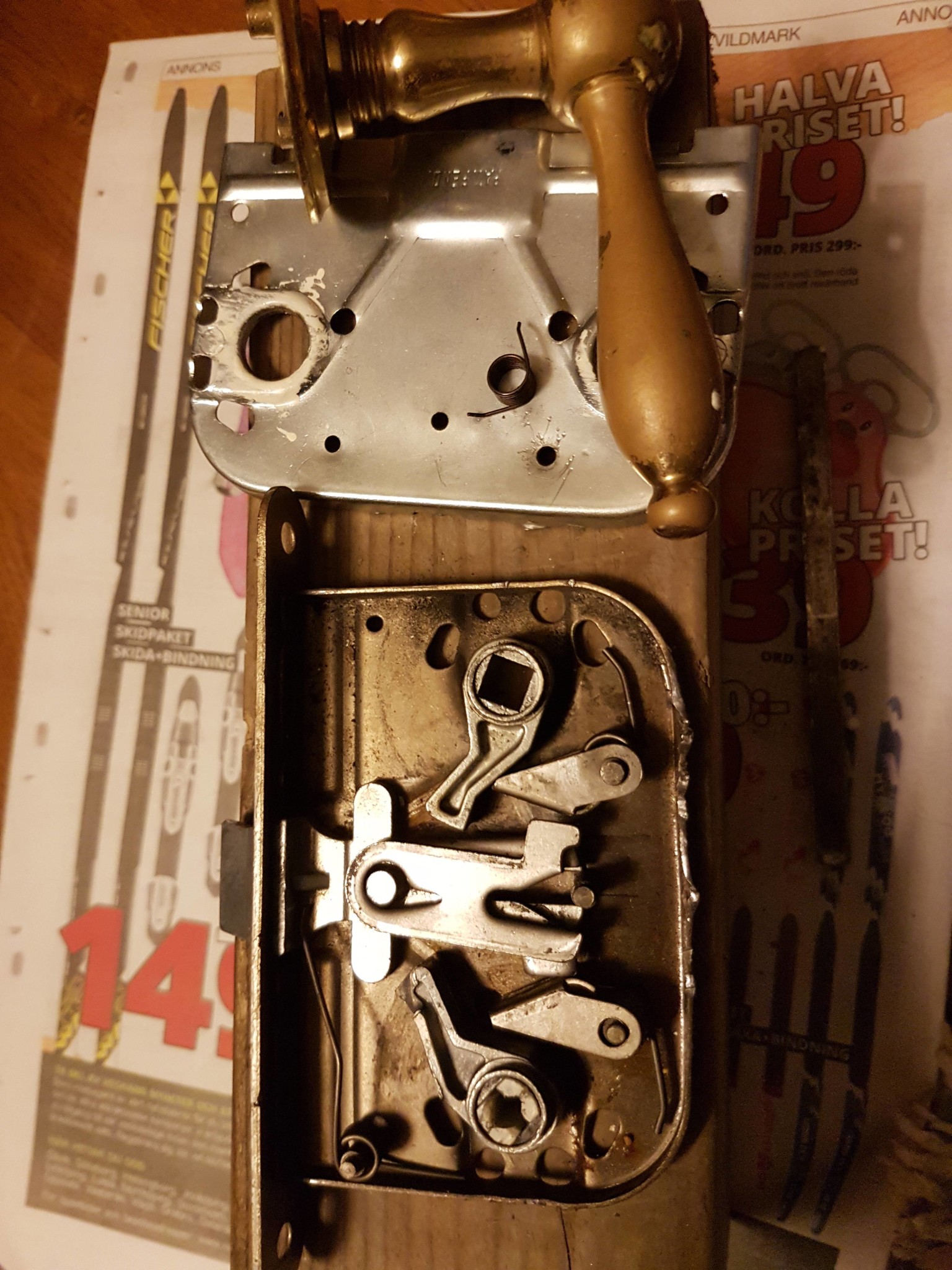 Det är en gammal Boda 414, det är enklare att köpa ett nytt likadant eller annat valfritt nytt innerdörrslåshus med ett nytt slutbleck.