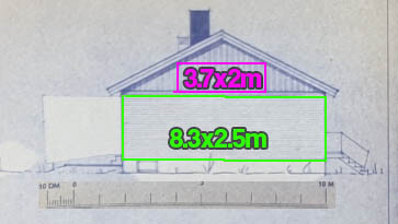 Jag vill inte klydda med tegelväggen, så primärt tittar jag på att montera över den svarta gavelpanelen (lila ruta). Enligt ritningen så ser det ut som att jag får plats med 3 stycken stående paneler (~195x113cm styck). En komplett setup kan då vara: