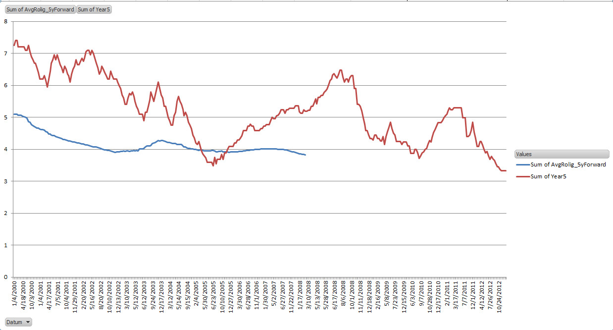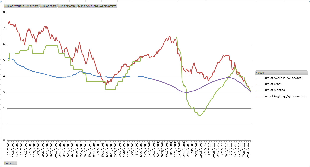 Lägger man in 3 månadsränta i grönt, och "förväntad" genomsnittlig ränta 5 år framåt (baserade på den 3 månadsränta som finns, så förutsägelsen blir sämre och sämre ju närmare dagens datum man kommer) i lila ser det ut såhär;