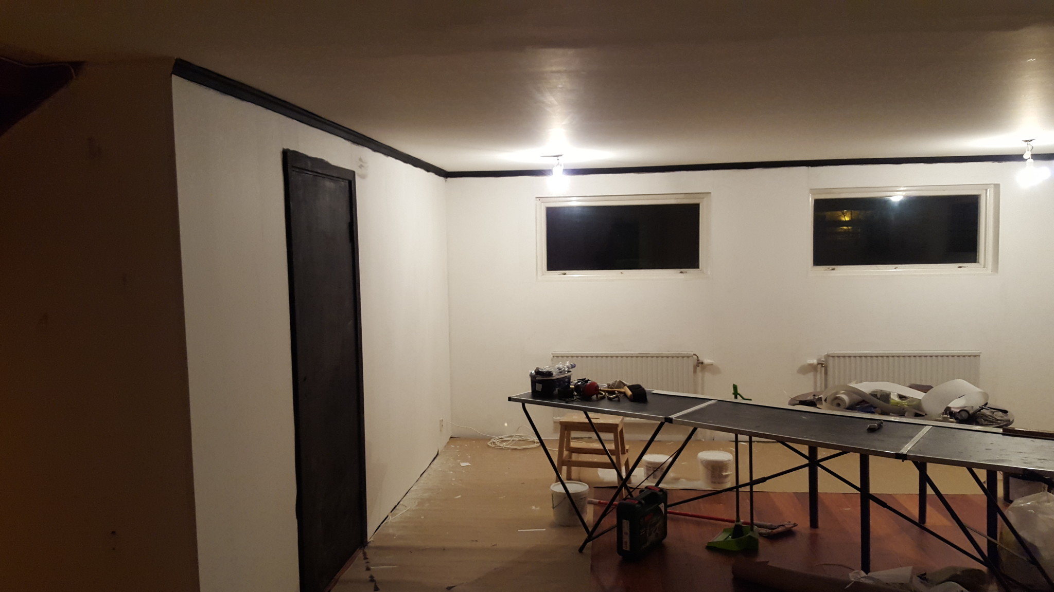 På det gamla korklaminatgolvet la vi en grå heltäckningsmatta och i taket skruvade jag upp svart nålfilt som blev över förväntan bra. Dämpar ljudet och ljuset riktigt bra. Här ser ni halva med vanliga gipsskivorna och halva med nålfilten.