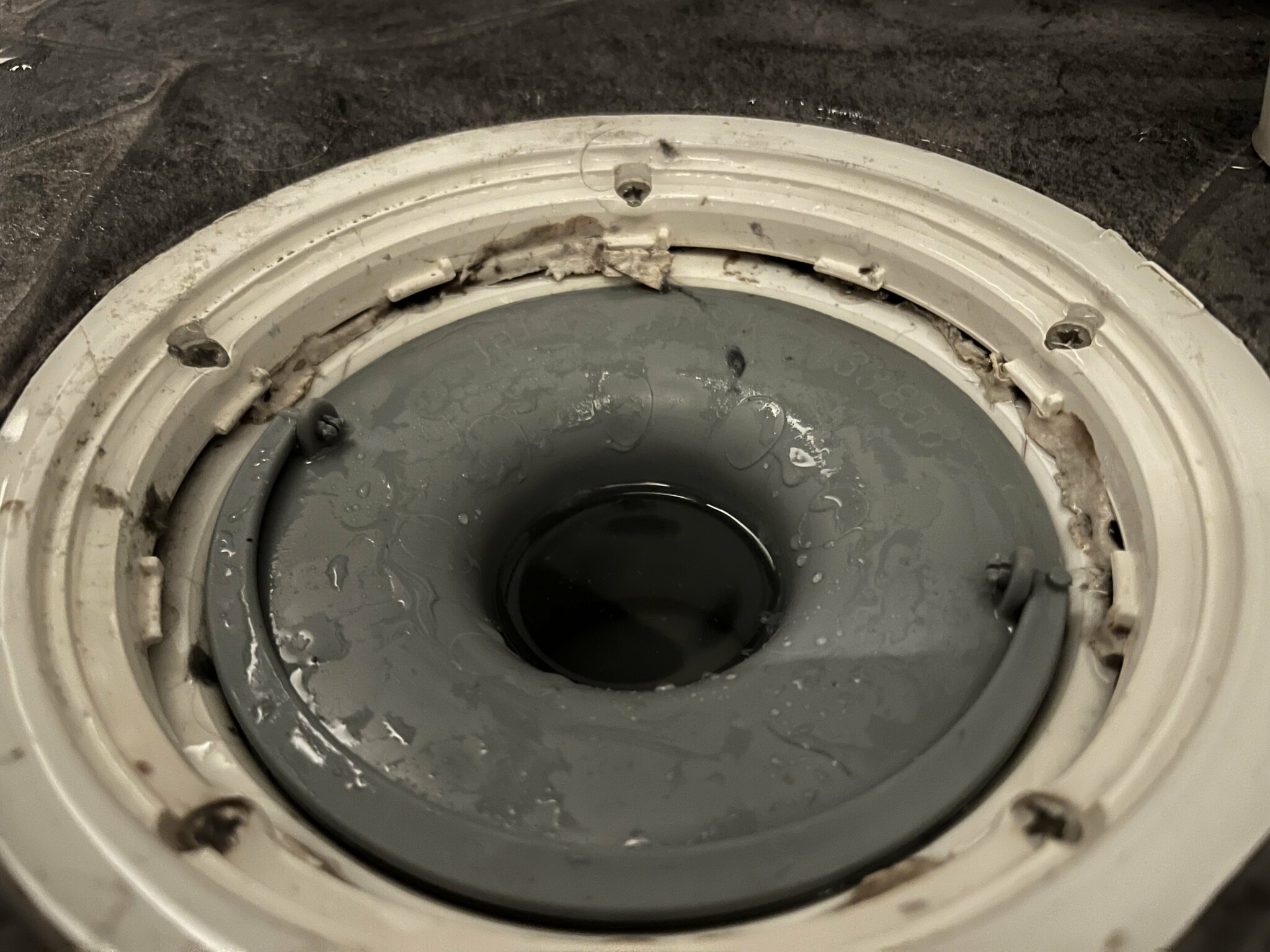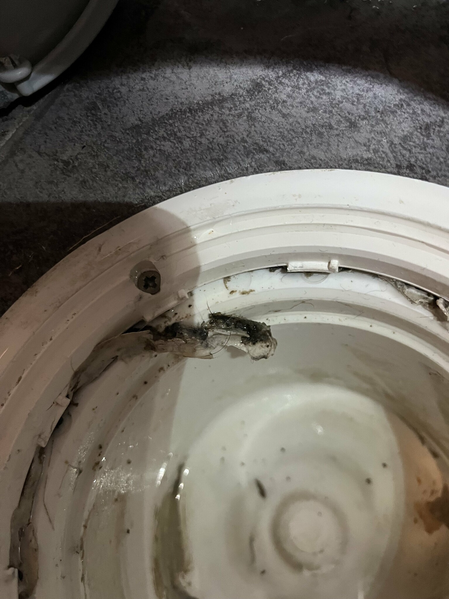 Skulle rengöra vattenlåset i tvättstugan golvbrunn idag och noterade att det såg ut som smuts, typ torkat tuggummi runt om golvbrunenn, alltså just ovanpå vattenlåset.