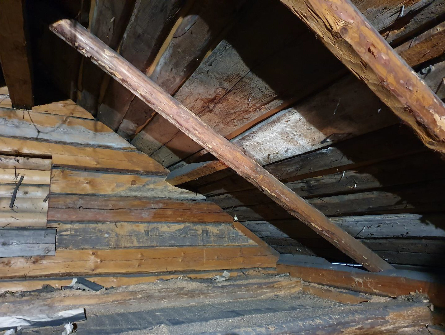 Taket består av takbjälkar ”stockar” 100x100s1200 som vilar på nockbalk 150x180. Material är timmer. Nockbalk landar på ny balk korsande hanbjälkar. Takbjälkar har på sidor upplag på dels balk och husets fasad.
