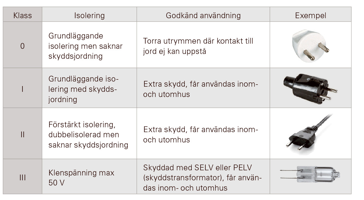 2. Det ansluts klass0-apparater i ojordade uttag, klass I-apparater i jordade uttag och klass II-apparater lite varsomhelst.