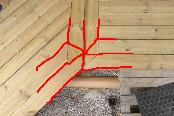 Detta hade varit bäst ihop med att korta ner farstukvisten (delen till höger iaf.) en bräda, och låta dessa möta i 90 grader (precis som de ligger idag, fast utan yttersta brädan) men jag såg på någon annan bild att den verkade liva med en fasad, och då kanske det inte är optimalt.