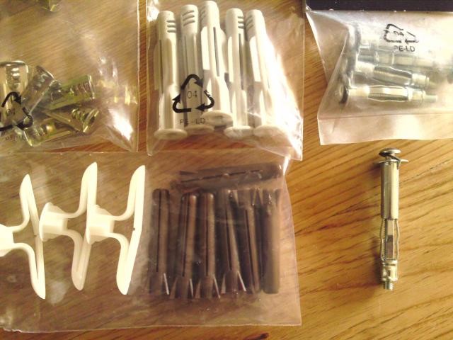Jag får ändå inte ihop hur en såpass tjock skruv som är så kort ska kunna fästas i en vägg (oavsett betong eller gips eller annat material vägg... :S). Se bild på alla alternativ till plugg jag har hemma för gipsväggar MEN ingen funkar med den tjocka skruven min "konsol" har och jag kan väl gärna inte skruva in den utan plugg i enkelgipsvägg.