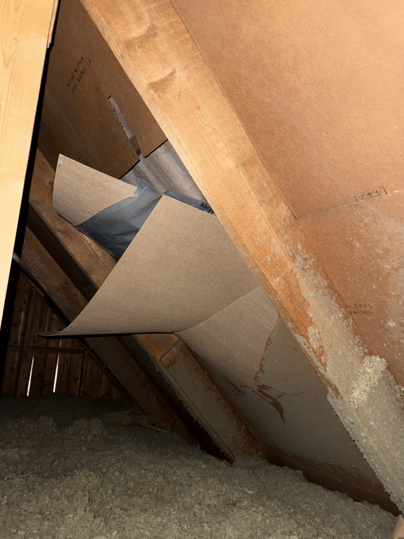 Hej! Vi har precis upptäckt att masoniten på vår vinden har knäckts på ett ställe och sliter med sig folie. Det blåste storm för ett par veckor sedan och misstänker att det kan vara orsaken. Vad tror ni? Behöver vi utföra någon form av akut åtgärd? Inte vadat mig fram i lösullen ännu. Men det ser ut som man ser undersidan av betongpannorna. Inga skadade betongpannor på utsidan. Så det verkar hålla tätt. Men det känns som man behöver lösa förhållandevis omgående.