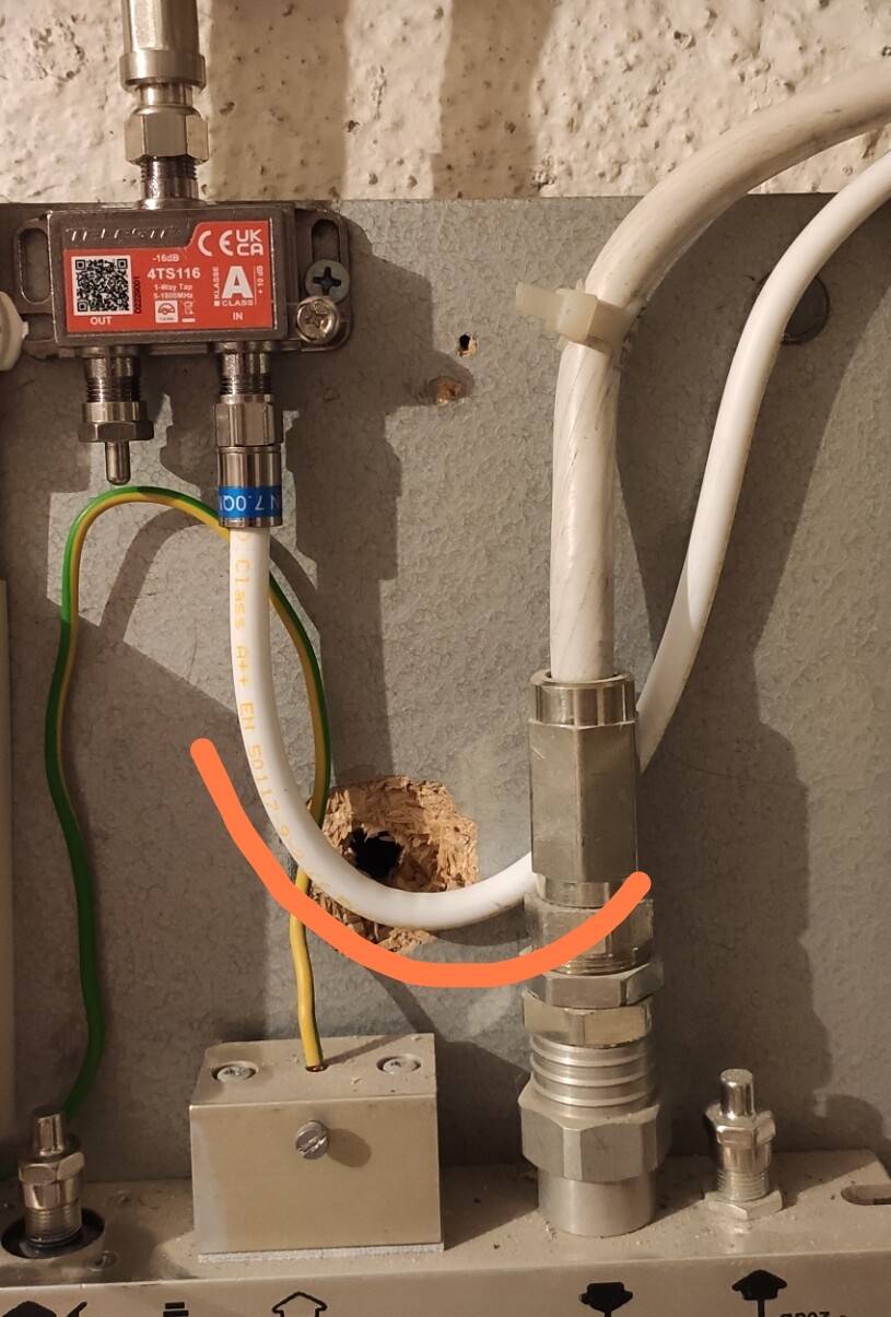- Vi hade nyligen en kille från Telenor här som installerade ny koaxiel till flerfamiljshuset. Är inte kabeln lite väl kraftigt böjd? Betydligt snävare än en snusdosa om nu detta är ett mått på lagom(?) Jag hade personligen gjort en större båge - finns ju utrymme för detta om man hade haft lite längre kabel. (Vi har max signalkvalitet enligt min tv, men sognalstyrkan är på 65%) Jag ska ringa Telenor imorgon.