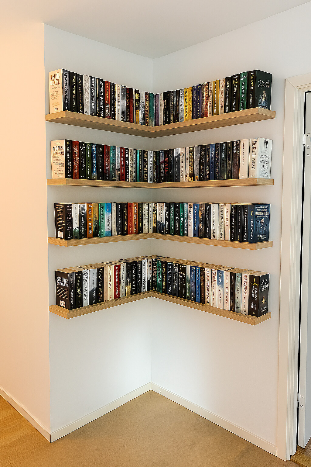Frugan har bett mig om att bygga lite hyllor till ett hörn för alla hennes böcker. Har frågat AI om en bild som beskriver önskemålet. Se den nedan.