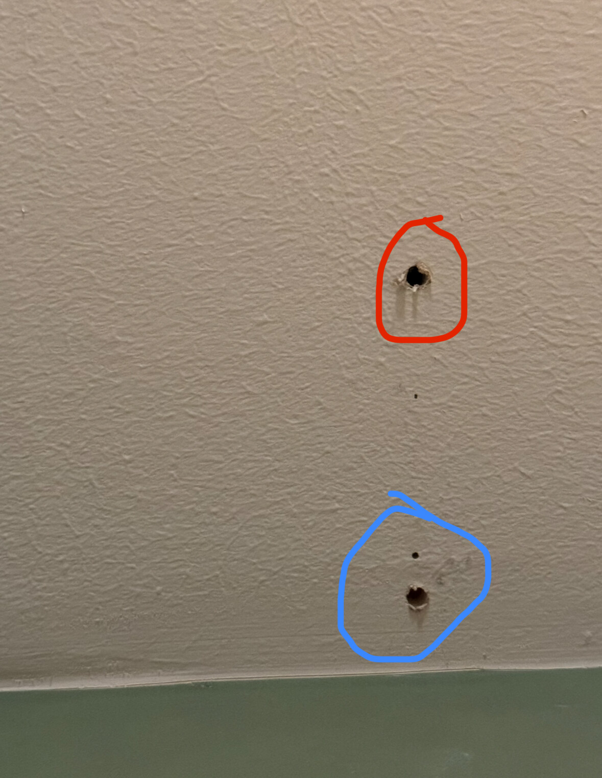 Nu kollat med en sådan kamera i takhålen. Hål med röd ring har massa mjuk isolering ovanför. Hål med blå har trä ptecis efter gipset. Vill gärna skriva inträet men vet ju inte hur tjockt det är och om något ligger bakom. Om jag väljer en skruv som går igenom. Sen vill jag inte borra ett 8mm långt hål genom träet heller för att se bakom då har ju skruven inget att ta i sen. Sen piper det längs med väggens kant hela vägen där uppe precis innan taket med kabelsökare
