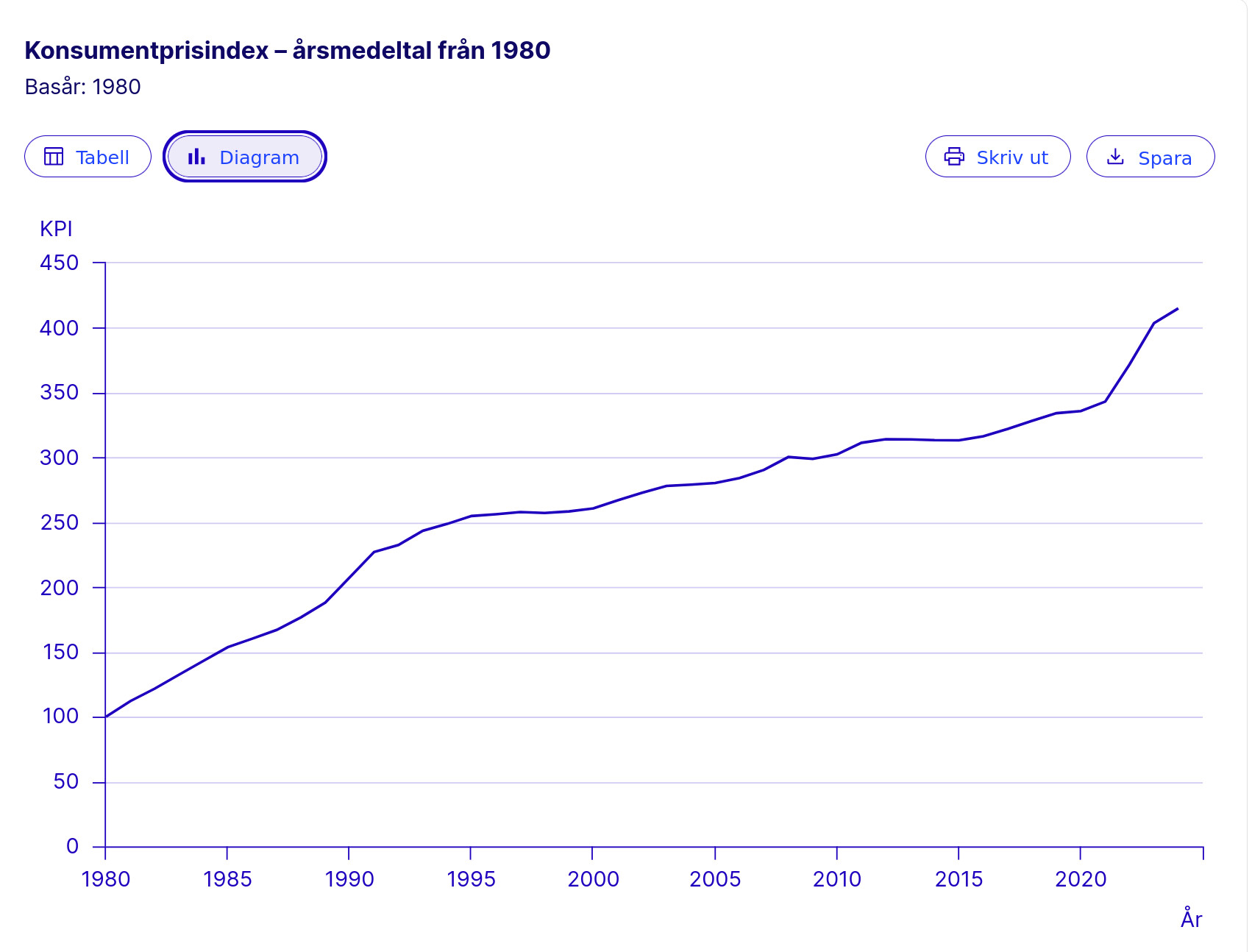 Från 2019 till 2024 har KPI ökat med 24 procent, från 334,26 till 415,15.