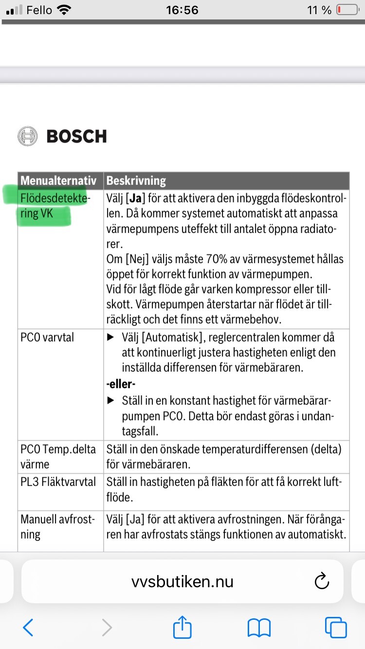 Det står sedan att om man stänger av den automatiska flödeskontrollen så måste minst 70% av radiatorerna vara öppna, annars kan flödet bli för lågt och kompressorn kommer ej att fungera.
