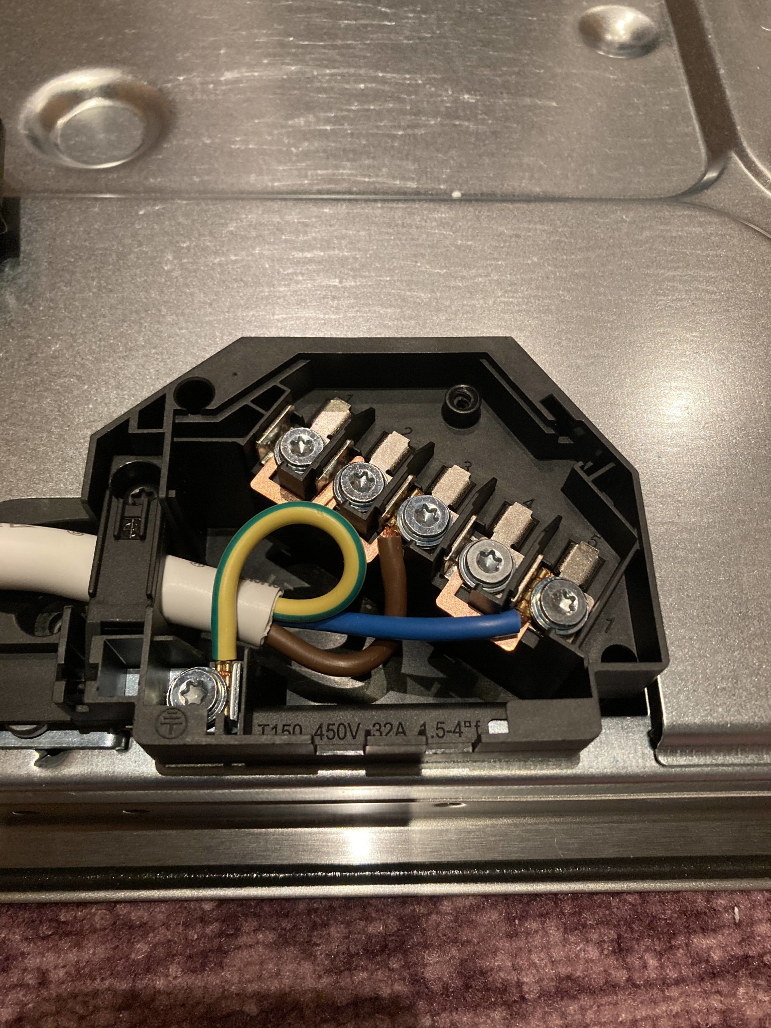 Tag bort kopparbyglingar mellan 1-2-3 och anslut där brun svart grå ledare i en ny kabel, blå och gul/grön jord skall sitta på samma plats som nuvarande. Bygel mellan 4-5 skall vara kvar med blå nolla ansluten.