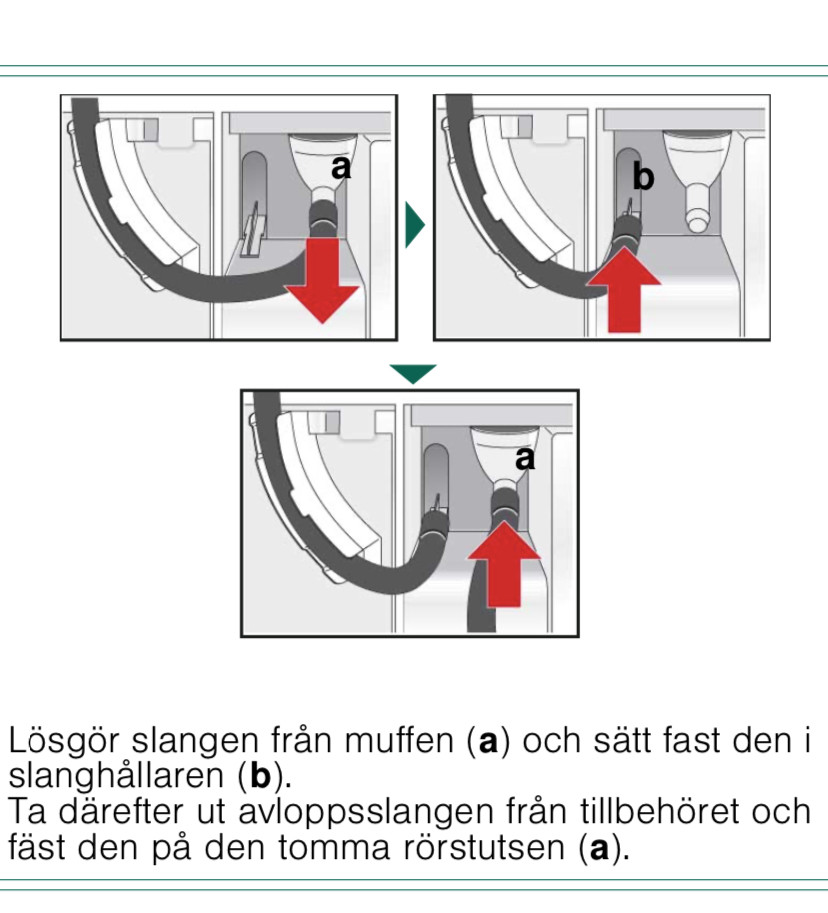 Har läst igenom tråden och tittat på det som behandlats men lyckas inte få ordning på torktumlare, en Bosch WTW87589SN, fyra år gammal. Den torkar tvätten och man hör att det går igång wen pump och behållaren fylls men det kommer inget vatten ur avloppsslangen. Jag har anslutit den enligt instruktionen här https://media3.bsh-group.com/Documents/9000732223_D.pdf . Ingen propp kvar i botten alltså.