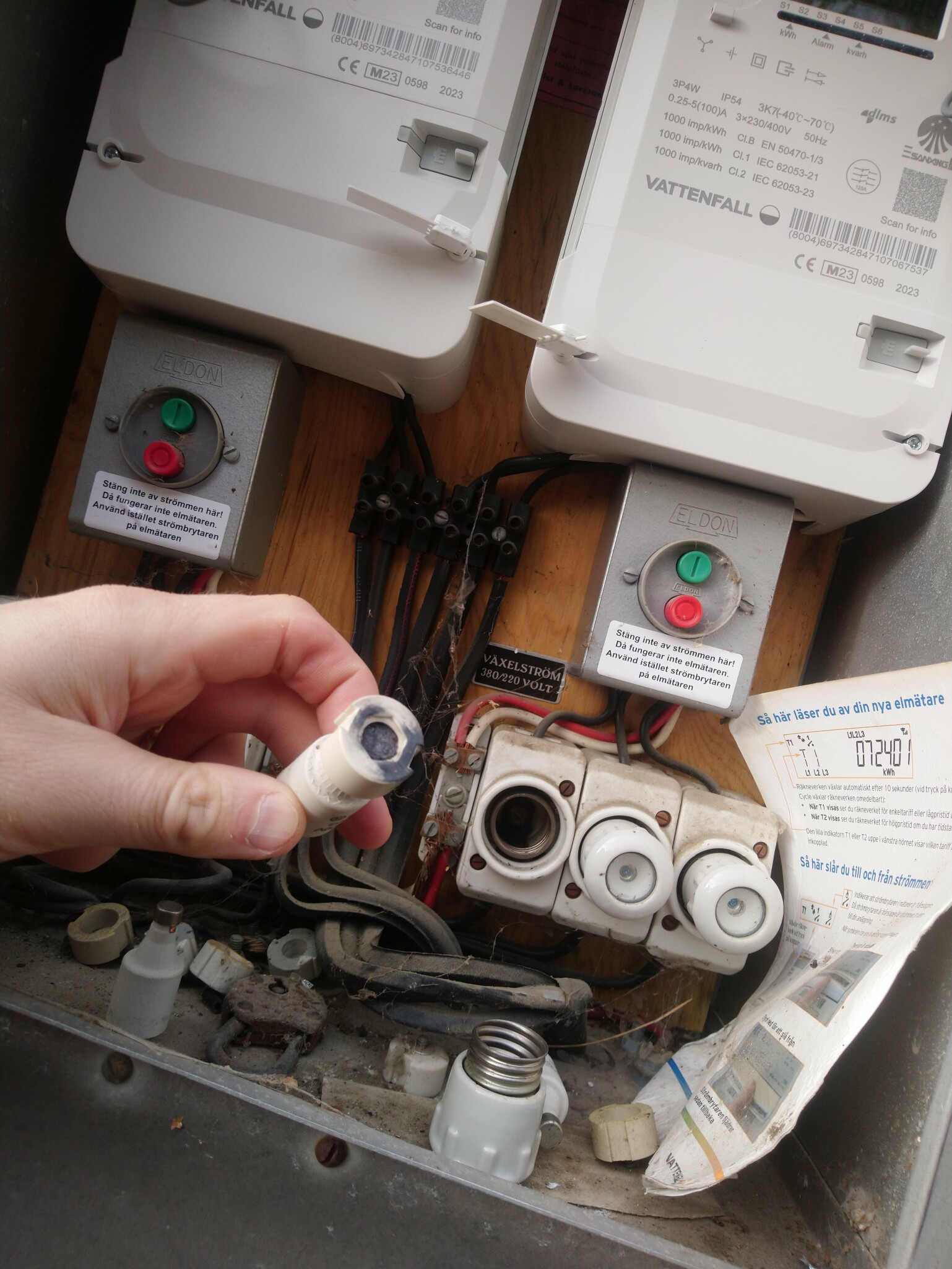 Det visade sig att säkringen in till huset för en av faserna gått. Men inte bara säkringen hade gått. Även vad jag tror kallas botten-platta verkar vara sönderbränd.