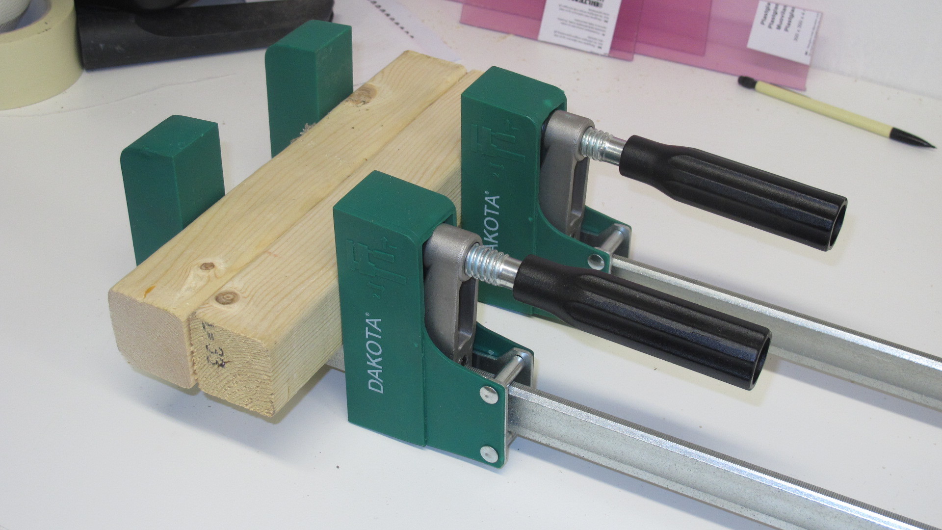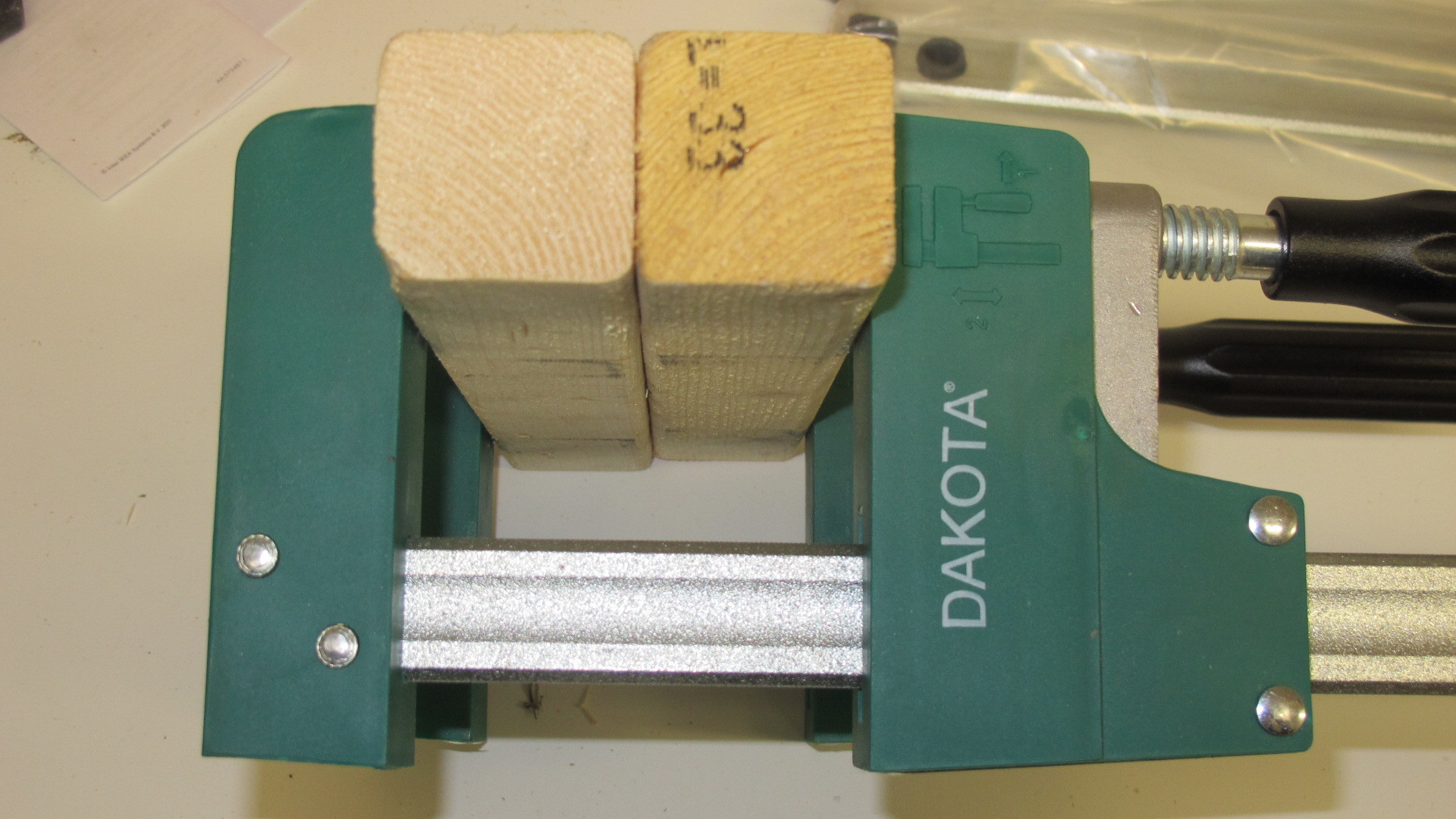 Tvingarna tycker jag verkar ok efter att ha känt och klämt lite på dem. Finishen är riktigt bra och det finns inga konstiga grader eller annat som man skär sig på. Funktionen är bra, dvs de håller ihop ämnena bra och utan konstigheter. Det är en viss tröghet när man flyttar den rörliga delen vilket jag tycker är bra. Jag testade att limma ihop lite skräpvirke utan någon som helst justering bara för att få en uppfattning om hur tvingarna beter sig. Det kändes och såg bra ut, tillräckligt bra för mina behov i alla fall. Käftarna håller sig parallella och levererar tillräckligt med tryck enligt min uppfattning