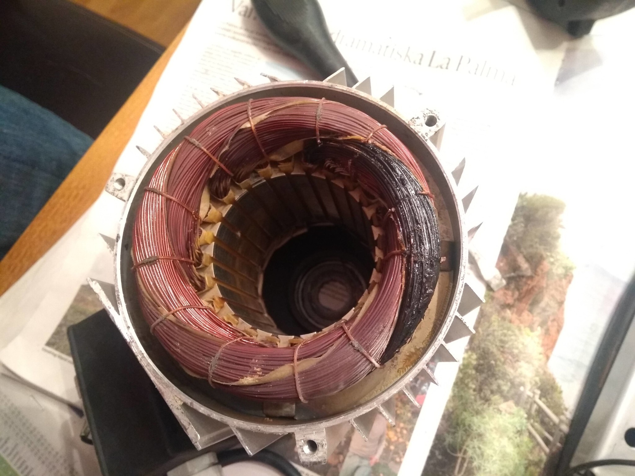 Efter att ha monterat isär motorn såg jag detta som bilden visar. Den är delvis bränd och därmed till min första fråga. Är det bara att kasta motorn som egentligen är ny men nu då lite bränd... en av trådarna är av och den är lite svart. För jag misstänker att det inte går att laga?!