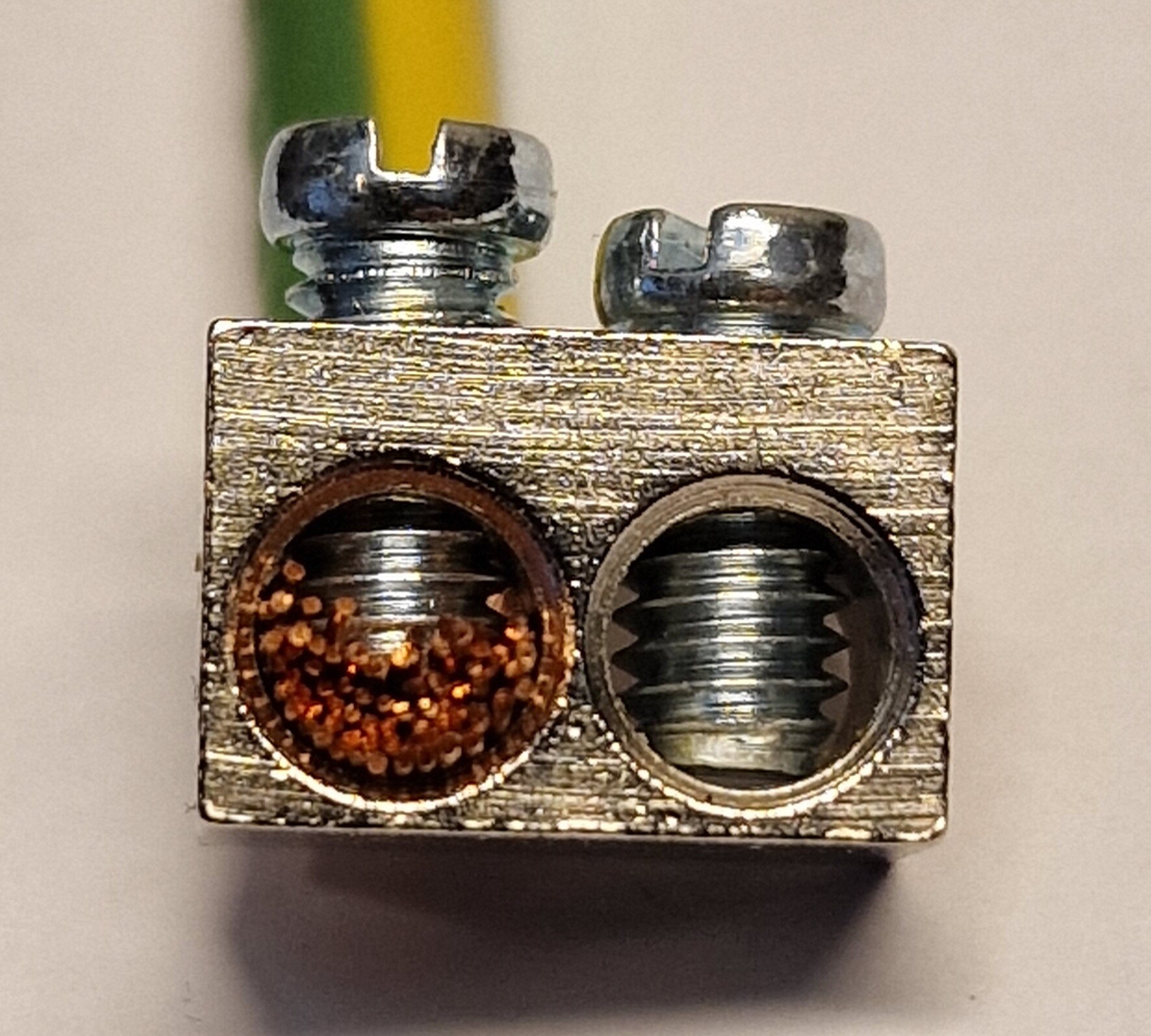 Fina bilder. Här är en Helag 1101. Den överensstämmer inte riktigt med din. Du har kanske än ännu äldre version från Helag. Jag satte en RK6 på bilden och det är svårt att misslyckas bara man drar åt lagom hårt. Visserligen täcker inte skruven hela bredden så ett gäng kardeler blir kanske utan kontakttryck, men det kan inte ha någon större betydelse. Vi får tro på den lösa skruven.