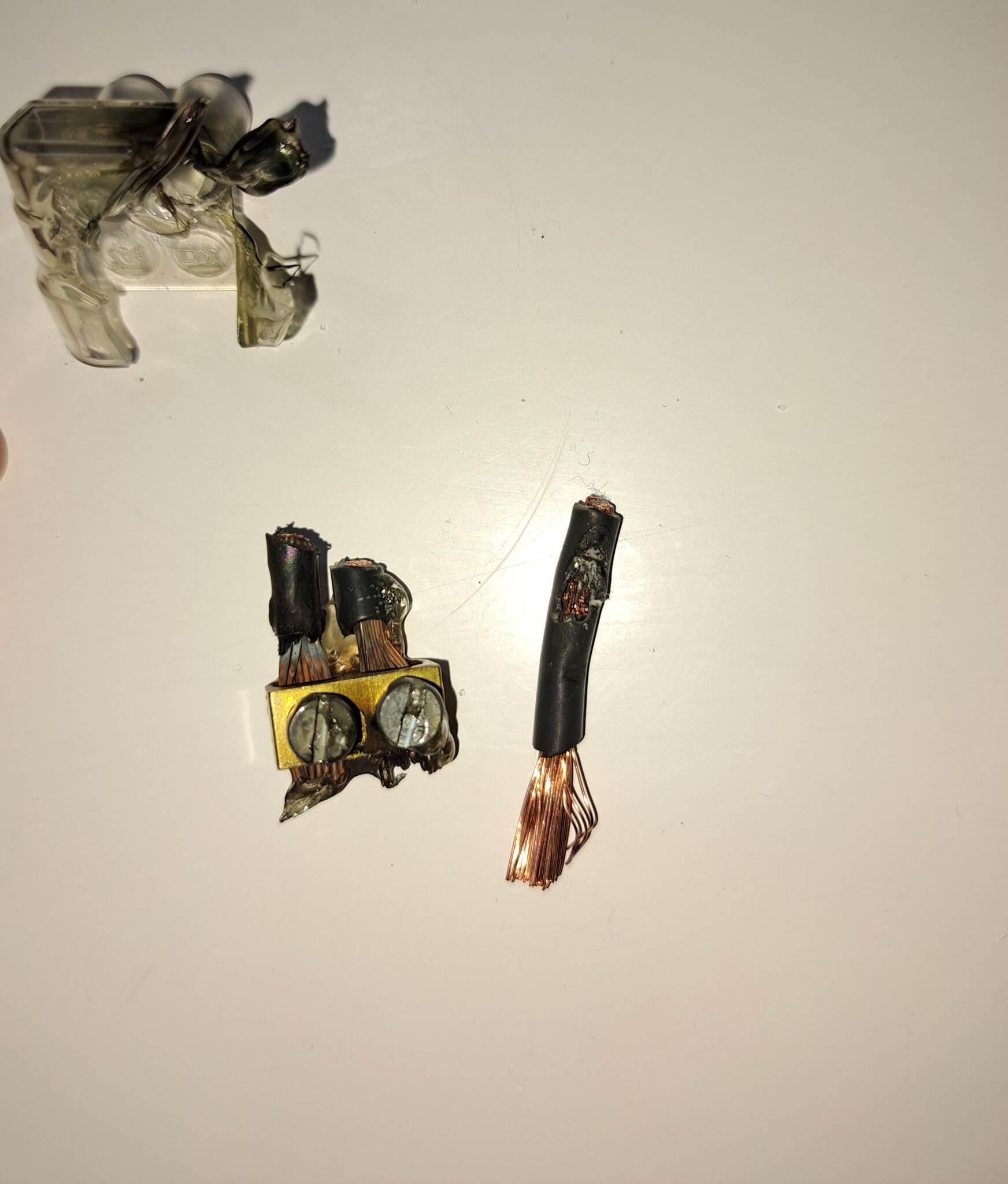 Kabeln till höger är en annan fas som antagligen blev skadad när centralen byttes,den låg dikt an mot den brända fasen och kanske kan förklara problemen. Den föll isär bara man petade på den.