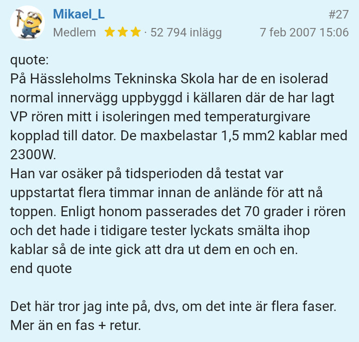 Jag kommer ihåg att det blev mycket snack om detta, minns jag rätt och inte minnet sviker mig så var det flera olika tester samtidigt, med både kabel i rör med fk i rör, med och utan isolering, någon av dem klarade sig bra utan att trilla över 70.tommib skrev:
