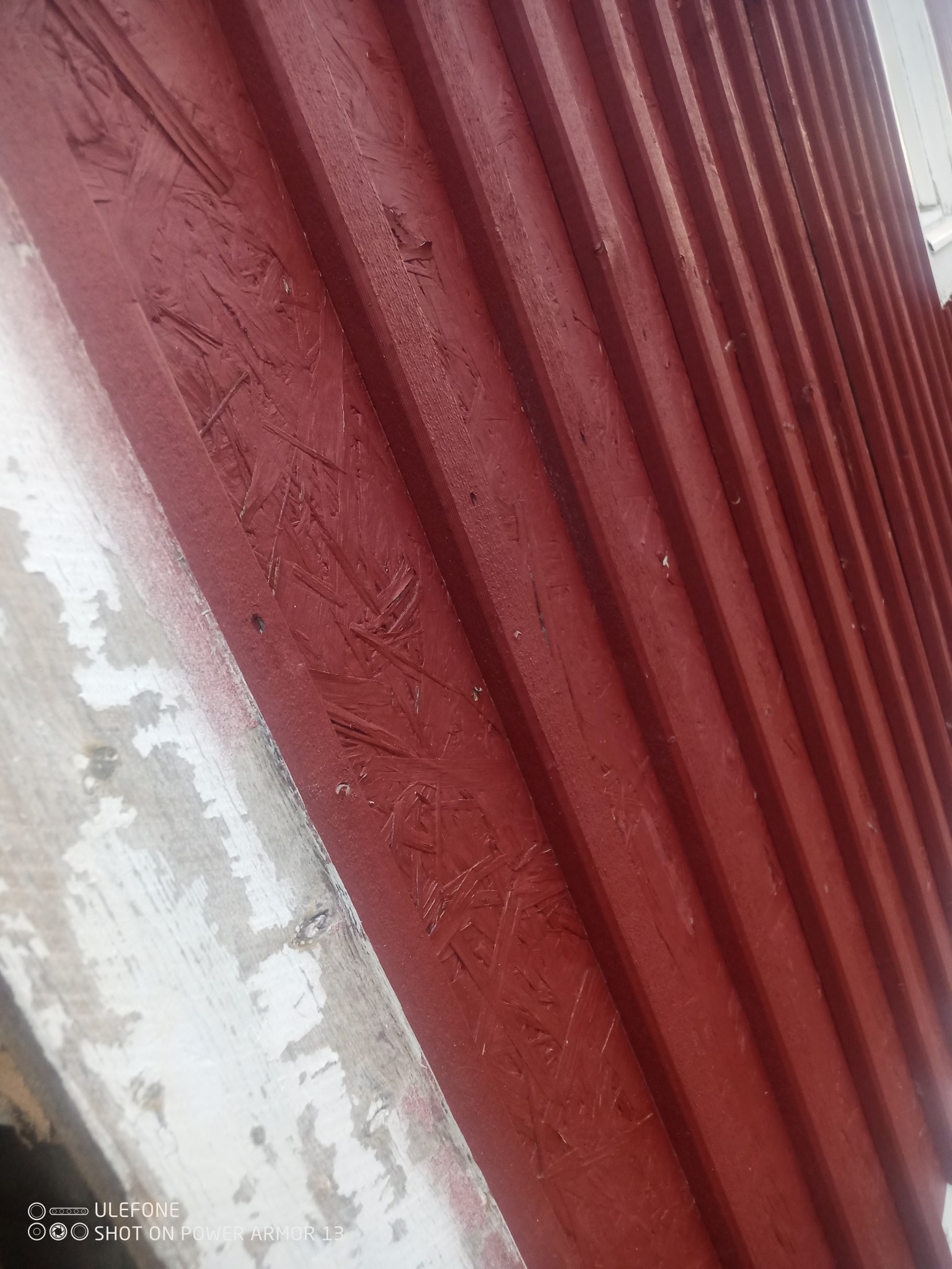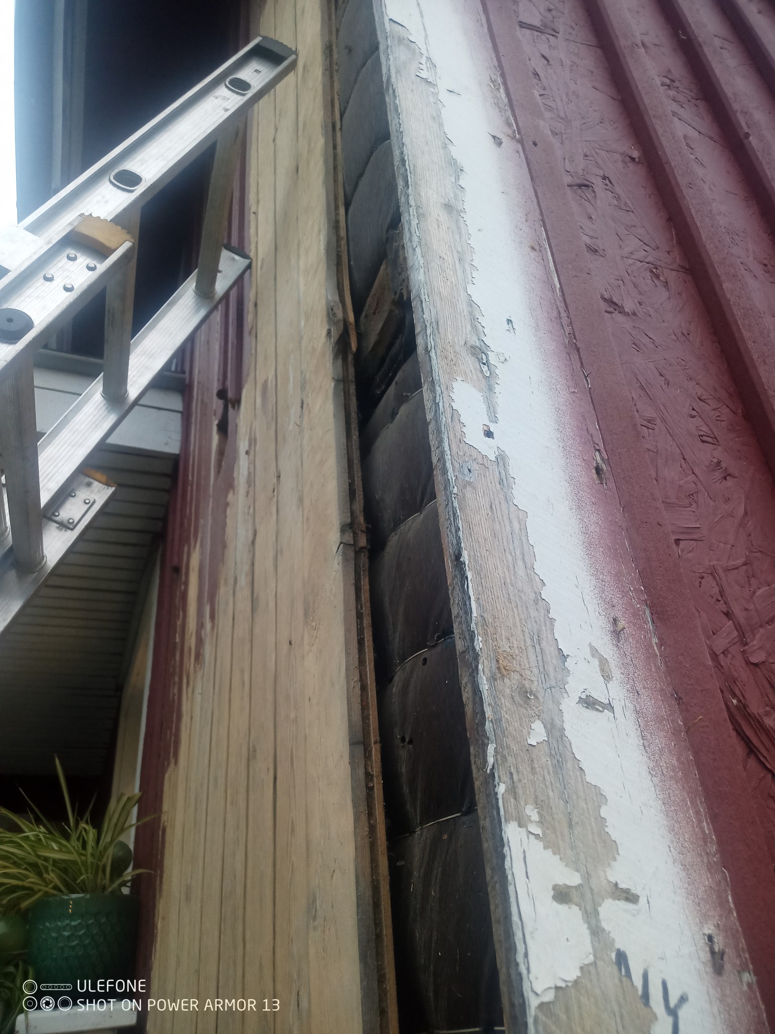 Gammal rötskadad syll bakom ytterfasad