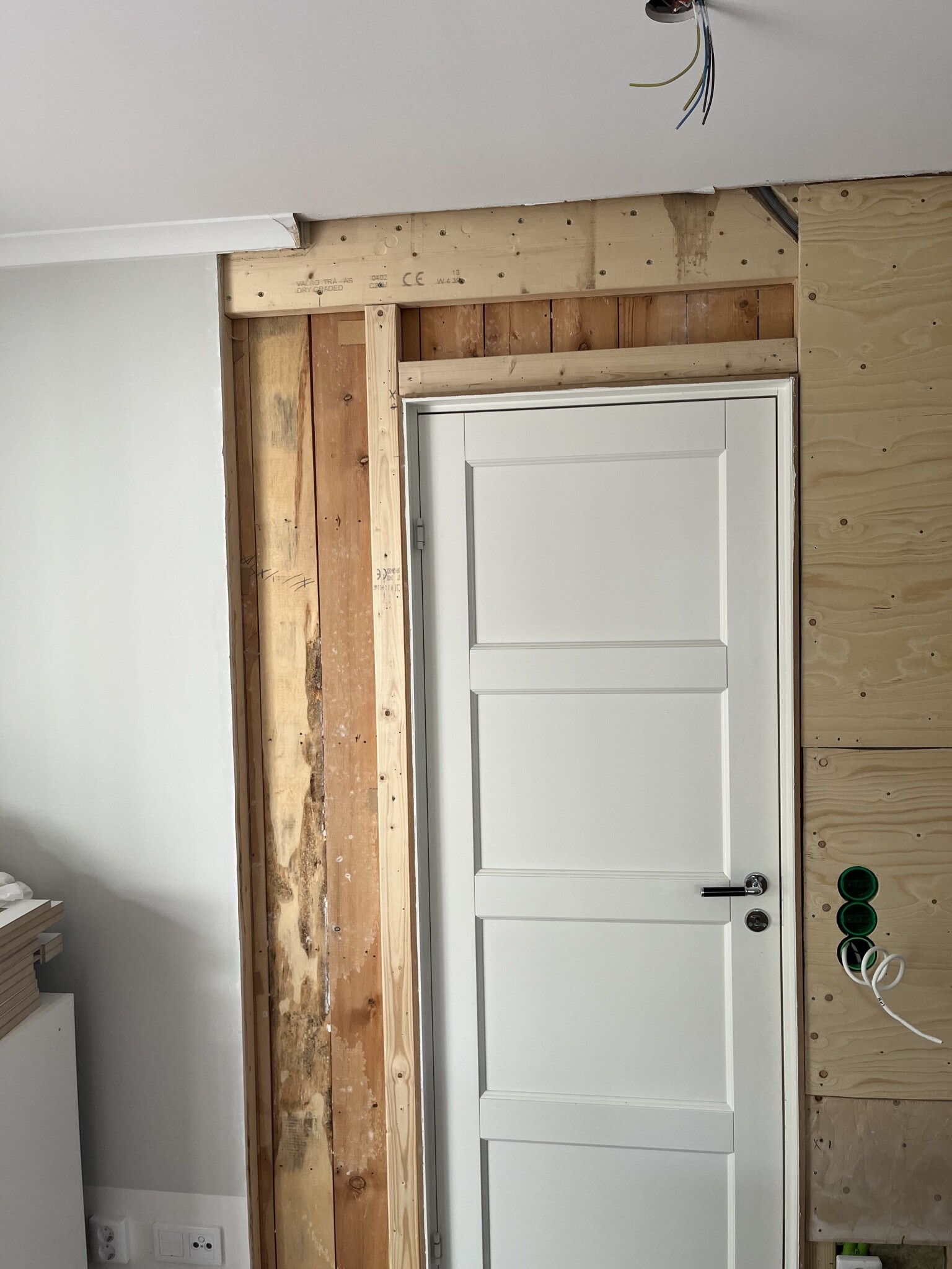 Jag vill ta bort dörren på bifogad bild och göra en större öppning ca 40 cm bredare åt vänster om dörren. Samtidigt vill jag öppna upp öppningen ca 20 cm mot regeln i taket.