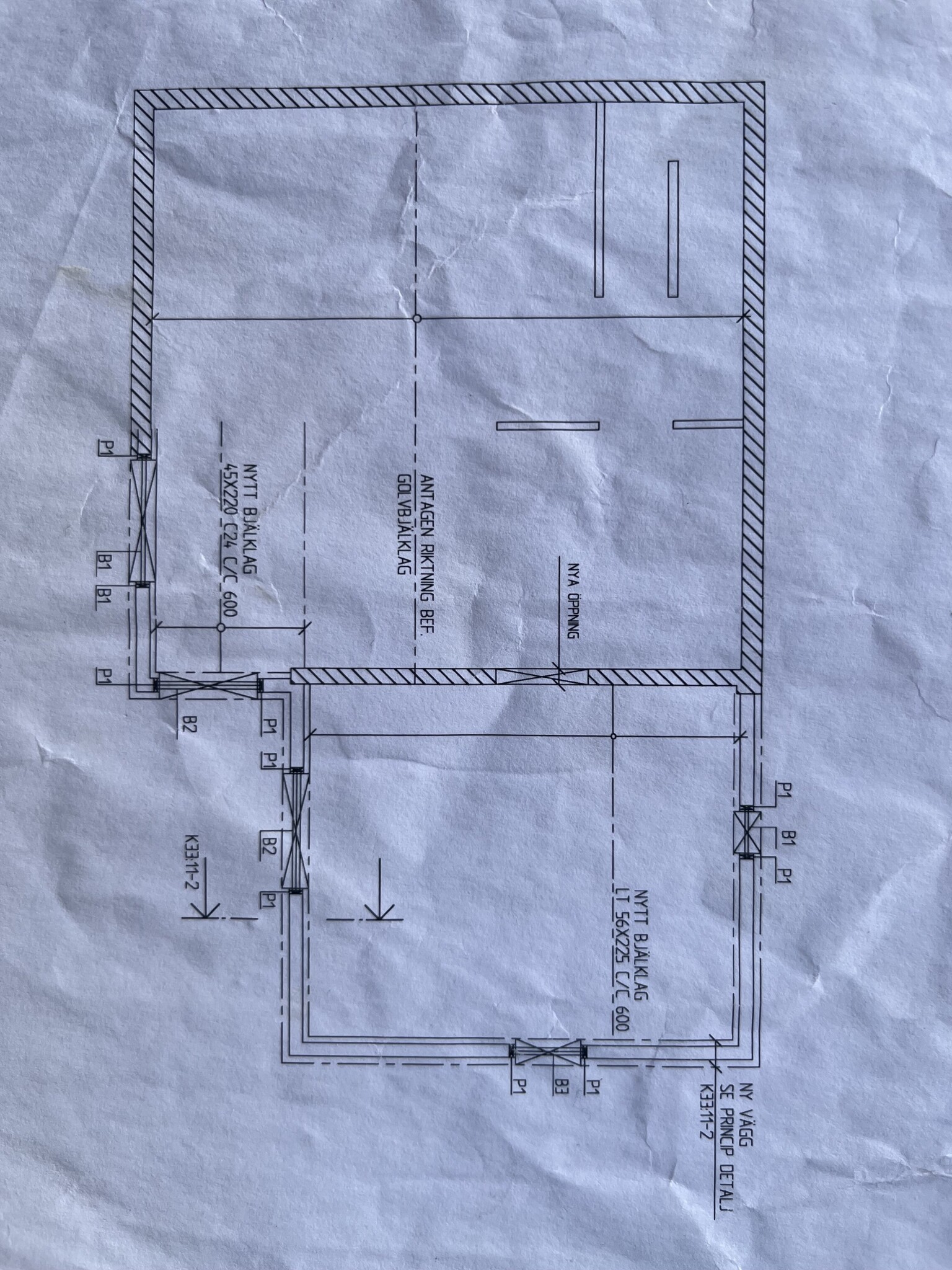 Mitt hus är utbyggt och kortet är taget från utbyggnaden in mot gamla delen och firman som byggde ut har skruvat fast den stora regeln i taket i gamla ytterväggen. Regeln stöttas inget nerifrån utan är endast fäst i gamla ytterväggen. Bjälklaget i utbyggnaden vilar på regeln på bilden och det ligger en regel precis där jag kapat gipset till vänster, en mitt över dörren och en precis höger om dörren.